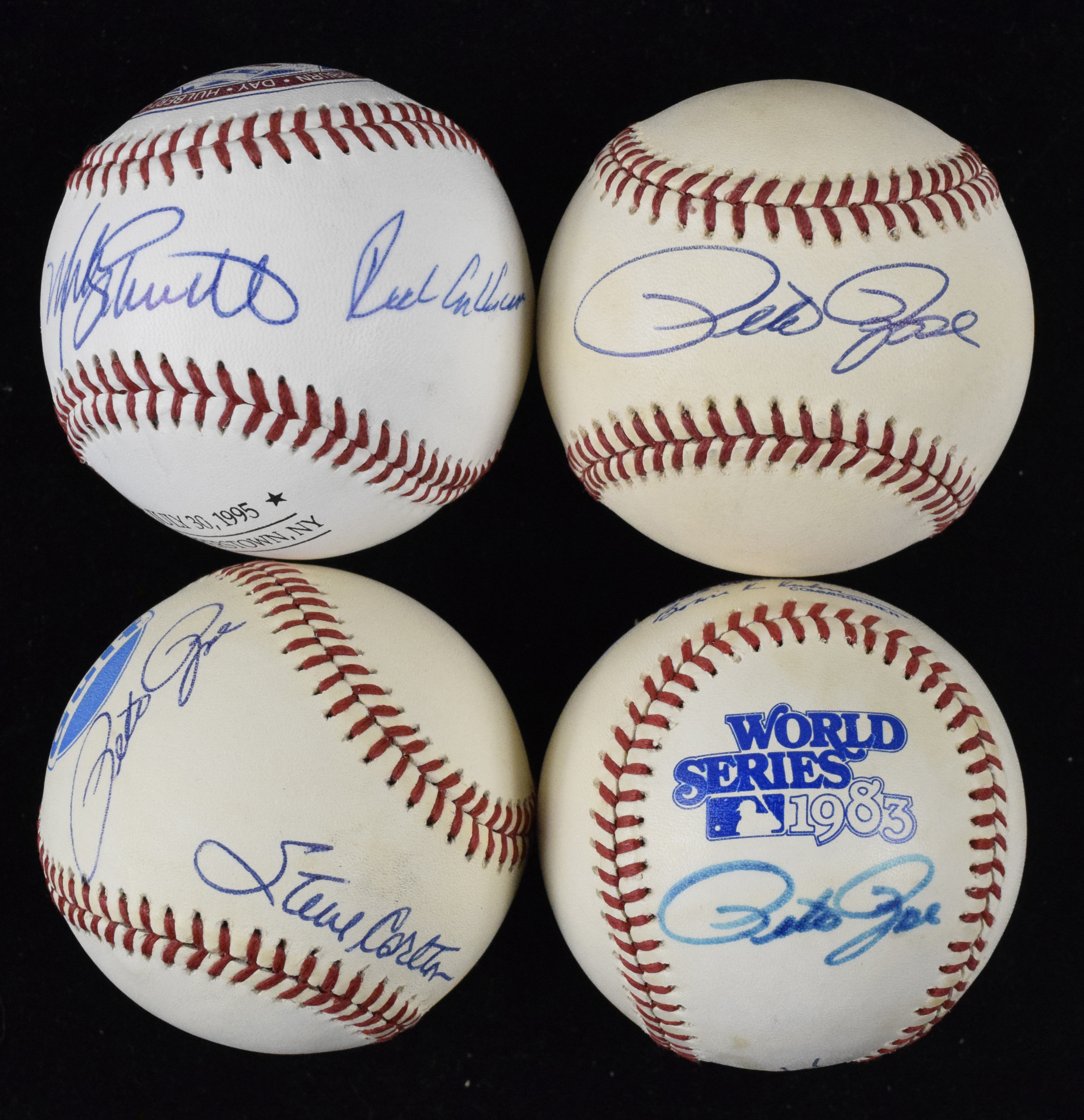 Description:Nice lot of (5) Phillies related autographed baseballs (EX-NM) Includes faux leather 1997 Hall of Fame logo commemorative baseball signed by Mike Schmidt and Richie Ashburn; 1983 Phillies 100th Anniversary logo baseball (by Rawlings/Gulf) signed by Mike Schmidt, Steve Carlton, and Pete Rose; (2) Pete Rose single signed Rawlings ONL baseballs, one of which is signed below a hand painted portrait; Rawlings Official 1983 World Series logo baseball signed by Steve Carlton and Pete Rose. Signatures rate 7 to 9 out of 10. Light toning and a touch of light wear: EX-NM