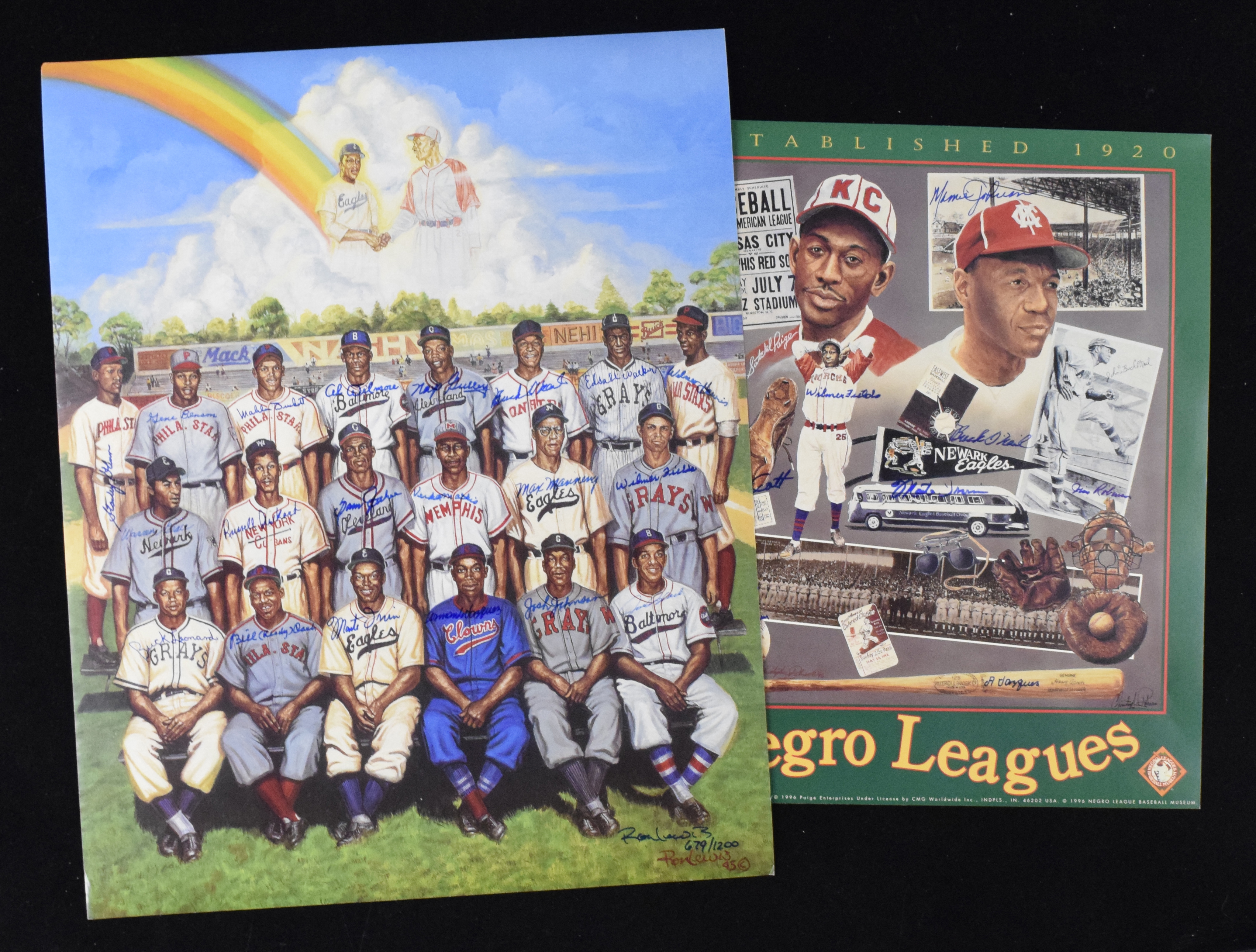 Description:Very nice lot of (7) autographed Negro League related limited edition prints/posters (VG-NM) Largest measures 24"x30". Includes limited edition print by Ron Lewis signed by (20) including Monte Irvin, Buck Leonard, Buck O'Neil, Mahlon Duckett, Gene Benson, Joe Black, Max Manning, Wilmer Fields, and others; Buck Leonard signed limited edition "On One Field" print; "Negro League Legends" print signed by (12) incl. Leon Day, Buck Leonard, and Monte Irvin; Leon Day signed limited edition print; Cleveland Buckeyes themed limited print signed by Sam Jethroe, Nap Gulley, and Willie Grace; Negro League Legends limited edition print signed by Josh Johnson, Bobby Robinson, Casey Jones, Buck O'Neil, Double Duty (Radcliffe), Joe Barnes, and Lester Lockett; "Negro Leagues" limited edition poster/print signed by Buck O'Neil, Monte Irvin, Wilmer Fields, and (4) others. Signatures rate 7 to 9/10 out of 10. There is some minor general wear (touch more accentuated in some cases - the Leon Day print has some toning/spotting throughout) nearly all of which would have little to no effect when each piece is matted and framed for display: VG-NM