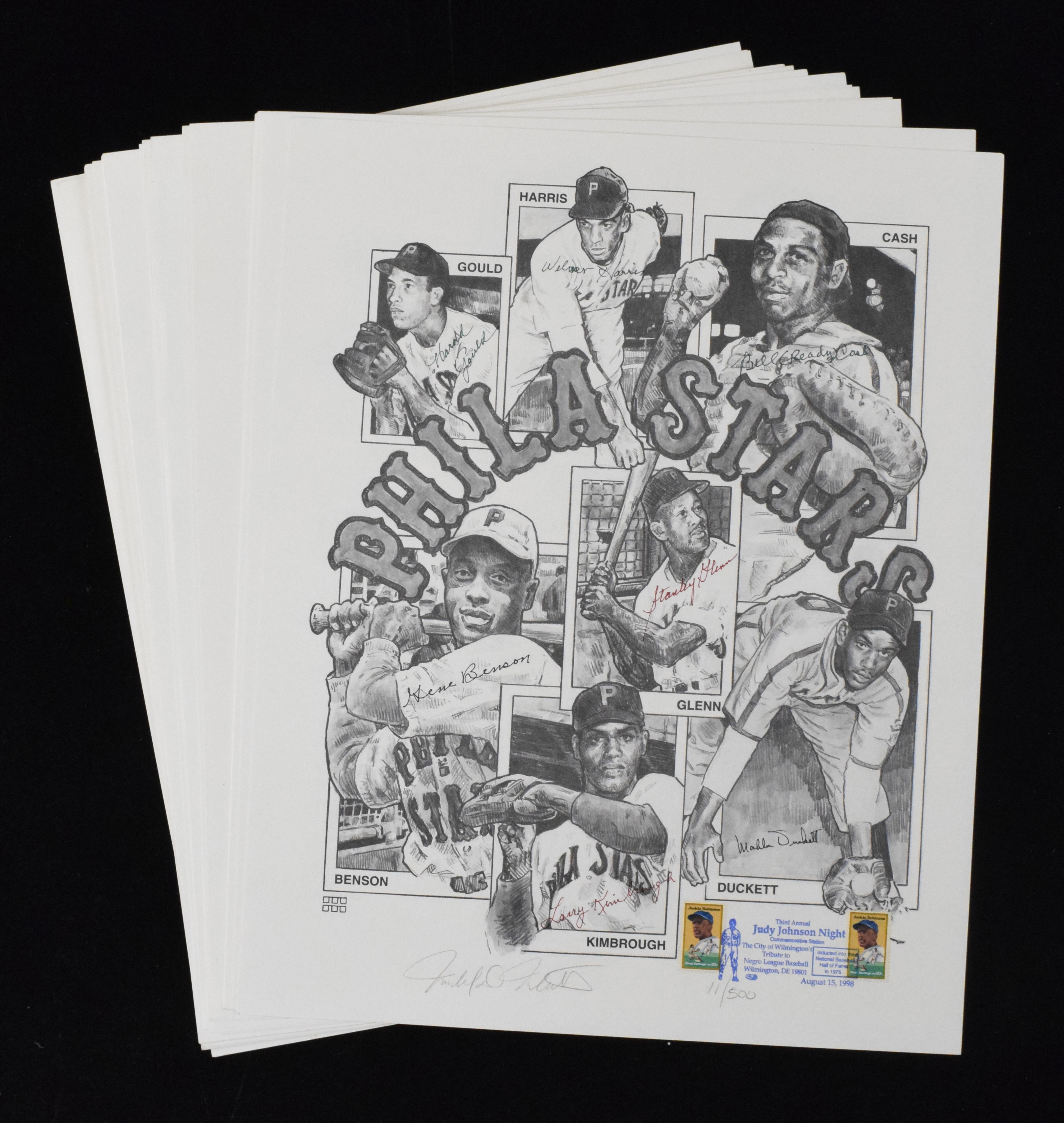 Description:Lot of (25) Philadelphia Stars (Negro League) autographed limited edition prints (VG-NM) Group of 16"x20" limited edition prints which are each signed by Gene Benson, Stanley Glenn, Mahlon Duckett, Larry Kimbrough, Bill Cash, Wilmer Harris, and Harold Gould. Marker signatures rate 7 to 9 out of 10. Also signed by the artist and numbered (out of 500) and each has a baseball related stamp(s) affixed which bear a Judy Johnson Night postmark. Touch of light wear is a touch more accentuated in a few cases (and all/nearly all should not be visible when matted and framed for display: VG-NM