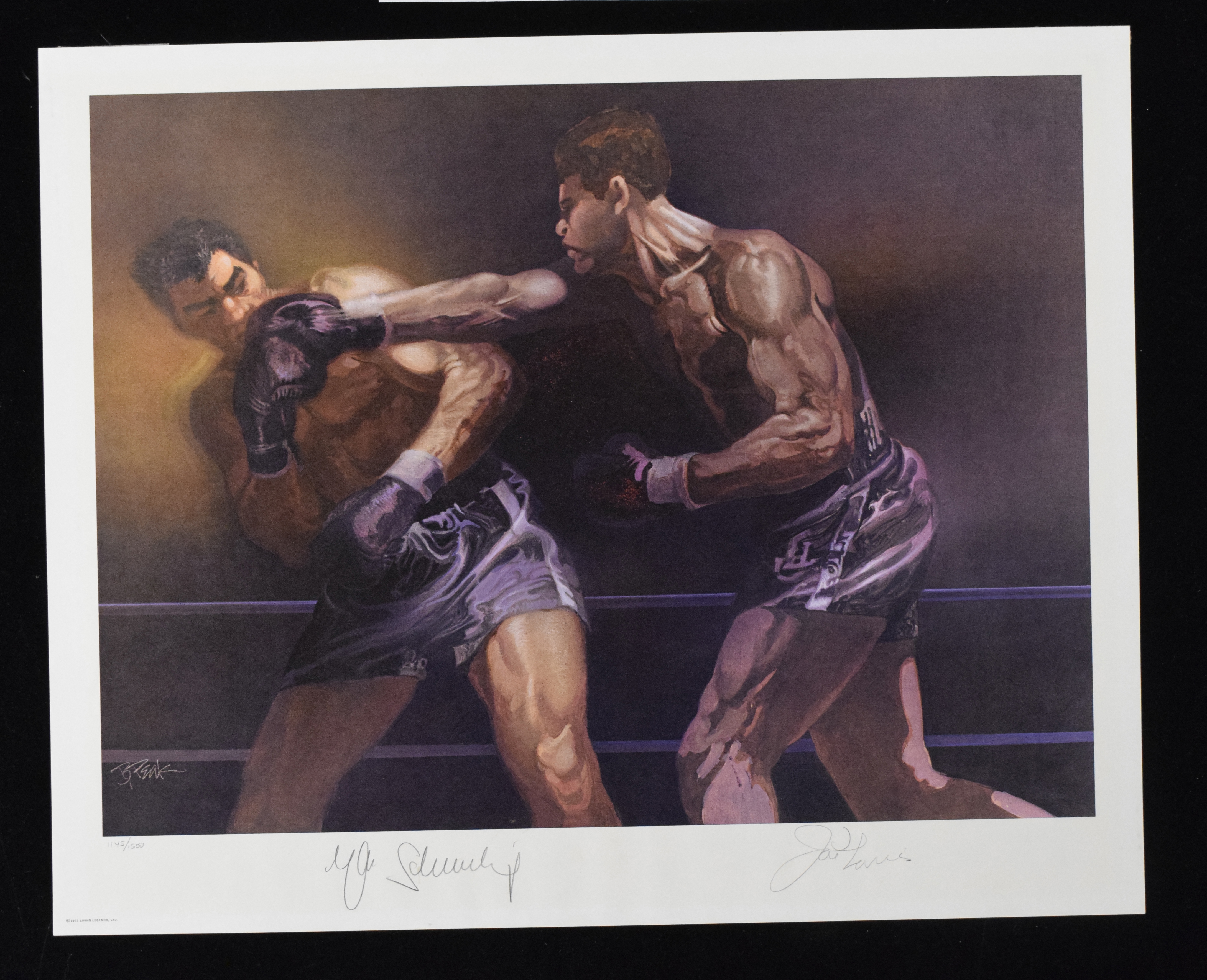 Description:Joe Louis and Max Schmeling autographed limited edition Bob Peak print (EX/MT) Issued by Sports Illustrated and numbered out of (1,500) pieces. Signed by both in pencil rating 8 to 9 out of 10. Measures 18"x22" and there is a touch of light wear: EX/MT
