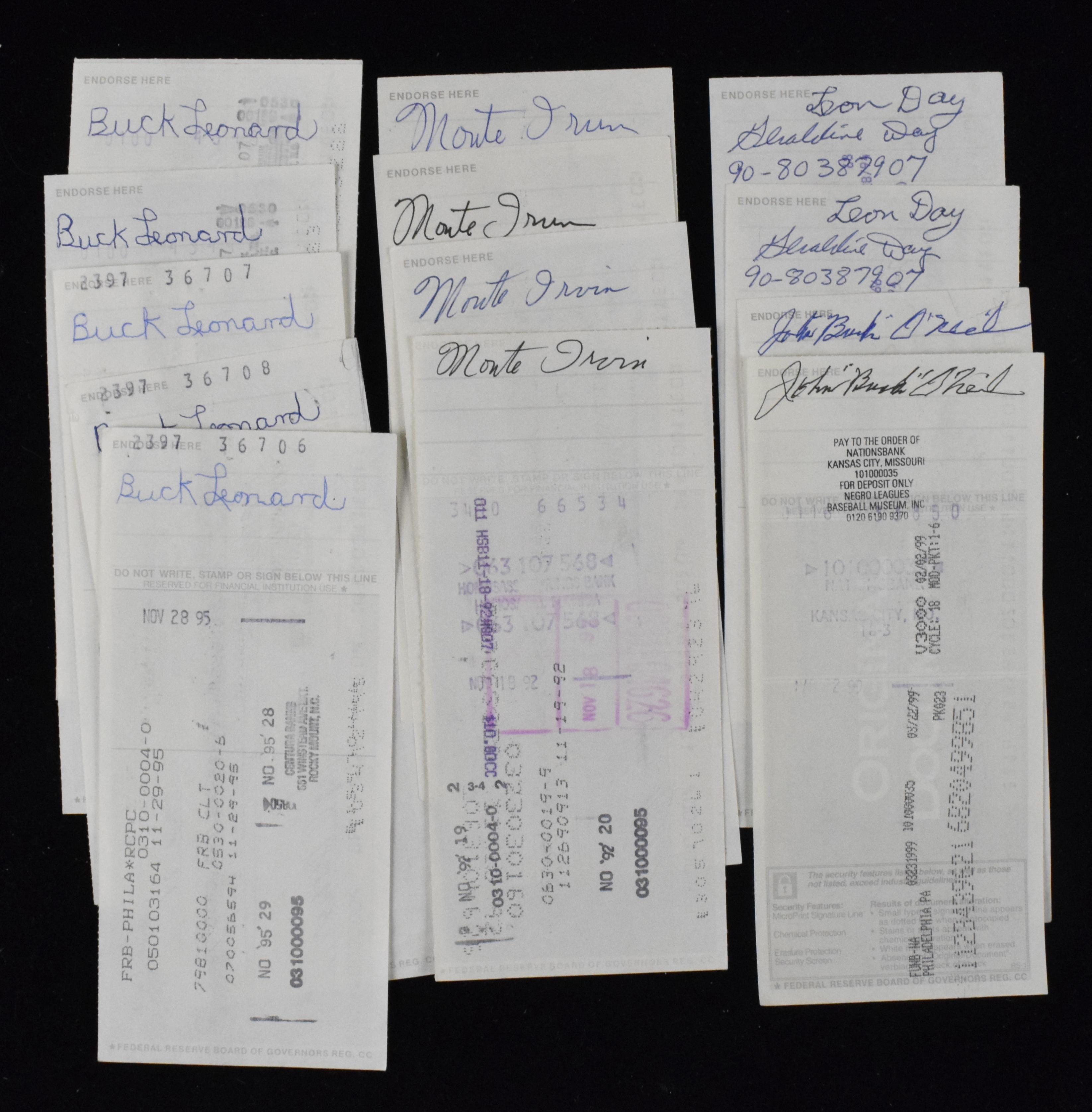 Description:Lot of approx. (170) Negro League player endorsed checks with Hall of Famers (GD-EX) Sizable lot of checks which were written to former Negro League players whom in turn endorsed them on the back. NOTE - the group has been screened with secreterial examples removed however it is possible that a few remain mixed in. In some cases there are (1) or (2) of given player and in others there are a good number more. Signatures generally rate 7 out of 10 or better and there is expected handling and bank cancellation related wear throughout. Sampling of the content includes (10) Buck Leonard, Ray Dandridge, (4) Monte Irvin, (3) Ted Radcliffe, (4) Sam Jethroe, (2) Buck O'Neil, and (2) Leon Day. Others are not well sorted and again there may be (1) or possibly a good number more but these others include Max Manning, Edsall Walker, Quincy Trouppe, Art Pennington, Jim Cohen, Lyman Bostock Sr, Mahlon Duckett, John Miles, Wilmer Fields, Stanley Glenn, Bubba Hyde, Verdell Mathis, and many others: GD-EX