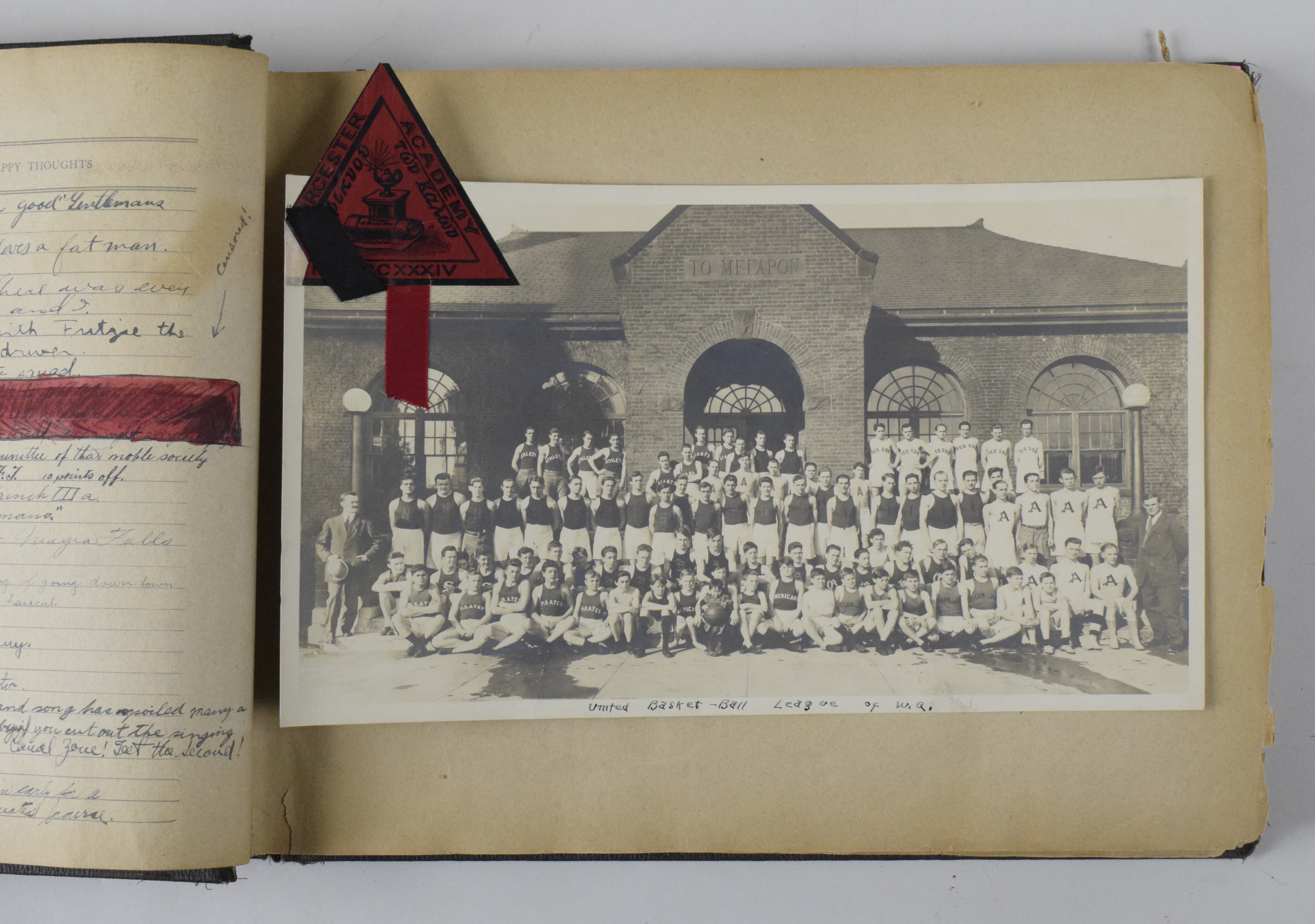 Description:c.1912 Worcester Academy scrapbook with great sports content (GD-EX) Period oversized (12.5"x17") scrapbook with has an impressed "Worcester Academy" crest on the front cover along with the name "Paul F. Berger." It appears to largely related to the c.1912 time period and there is some fantastic sports related material throughout. Some pieces worthy of mention include a large 8"x14" photo captioned "United Basket-Ball League" and showing players from different teams (one of which has "Red Sox" across their jerseys); 1912 Boston Athletic Association tournament program with Tris Speaker pictured inside; many pictures/similar pieces showing athletes including runners, football, hockey, and baseball; newspaper and other publication clippings; portions of scorecards; passes to games/events; some material related to other schools; non-sports related ephemera and photos; and some other pieces. Varying degrees/types of wear throughout and there are some small portions of pages which are cut away and some others where pieces have been removed: GD-EX ($500-$1,000)
