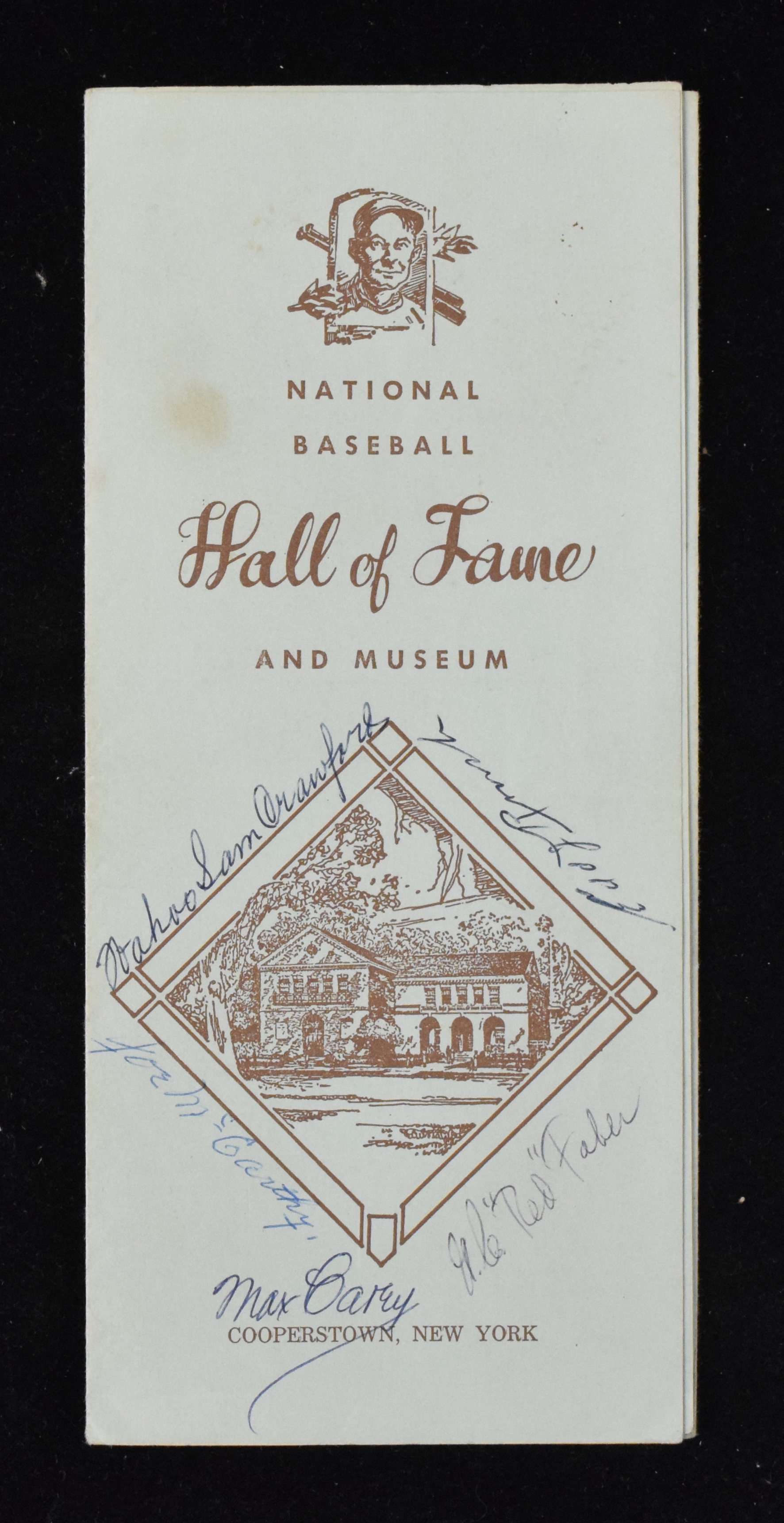 Description:c.1960s Hall of Fame brochure autographed by (5) inductees (EX-EX/MT) Vintage paper stock Hall of Fame brochure has been signed on the front by Wahoo Sam Crawford, Red Faber, Joe McCarthy, Max Carey, and Edd Roush. Signatures rate 7 to 9 out of 10. Light handling and storage wear: EX-EX/MT