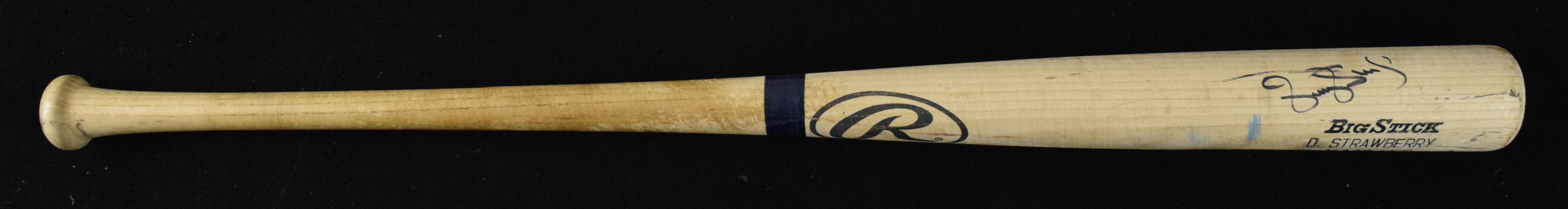 Description:Darryl Strawberry autographed 1998 professional model baseball bat - World Series champs season (VG/EX strong use). 35.5" Rawlings-Adirondack 595A Darryl Strawberry model bat with "32 1/2 Strawberry" lightly written on the knob. "044" batch number and "98" year code are stamped on the knob below the model number. Strawberry signed the bat in black marker. Signature rates 8 out of 10. Impressive use with ball marks, pine tar, and small handle crack: VG/EX ($400-$600)