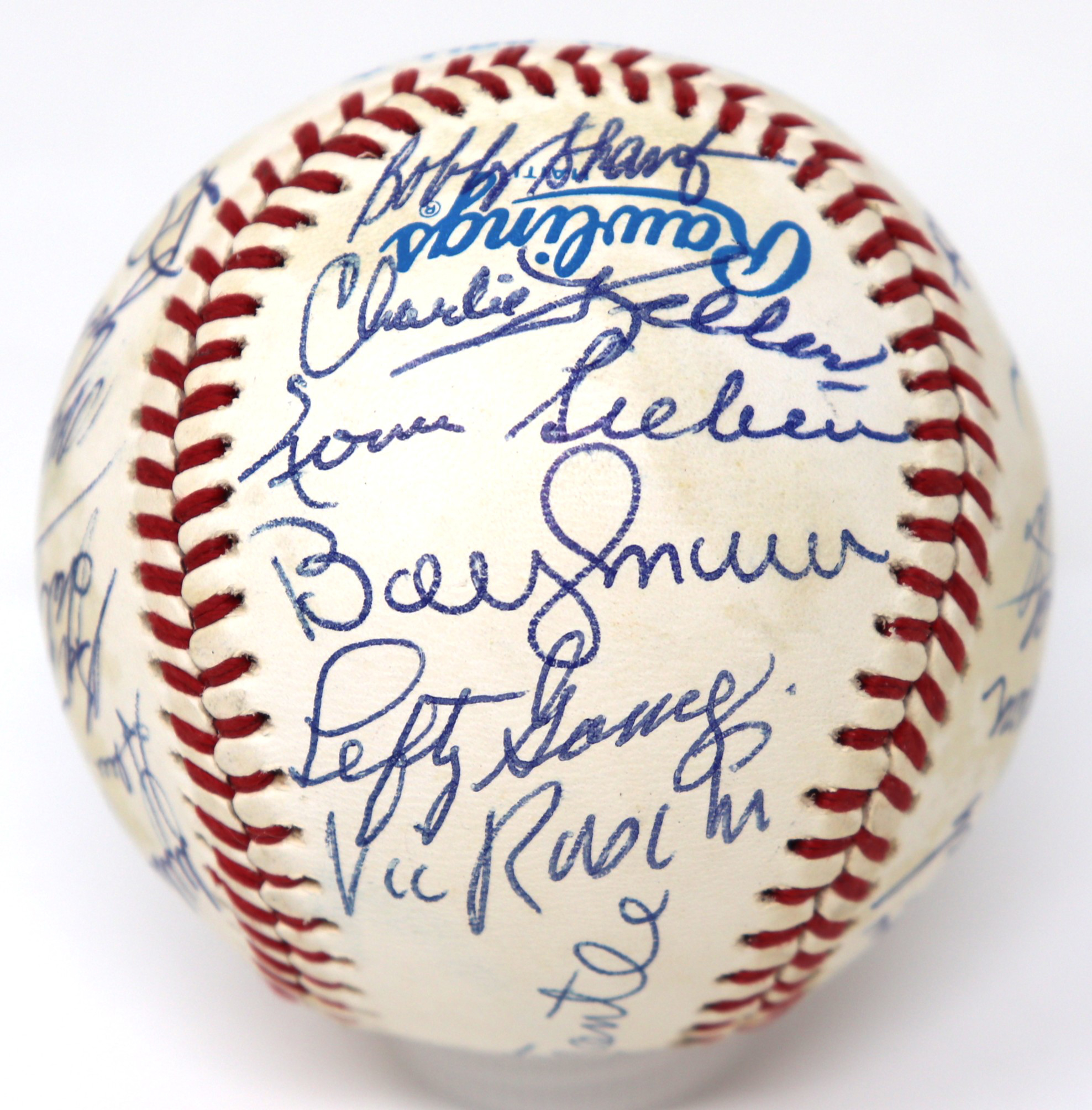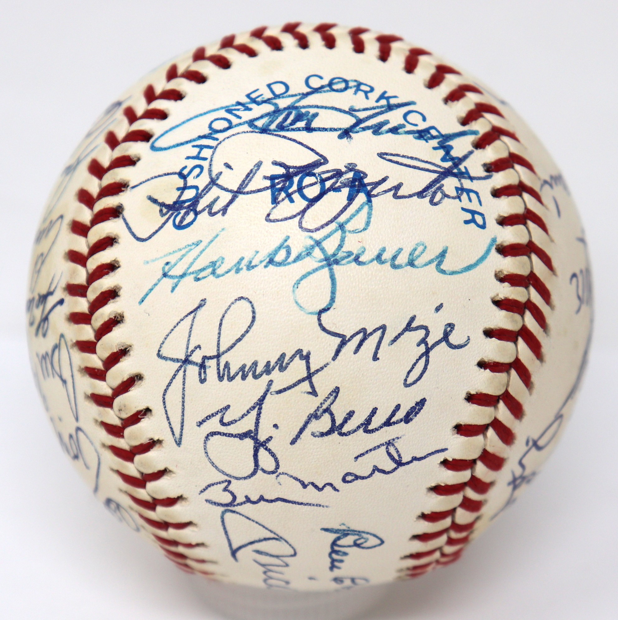 Description:New York Yankees old timers multi-signed baseball with (28) autographs including Mantle (EX-EX/MT). B.Brown American League ball signed by (28) including Mickey Mantle, Lefty Gomez, Yogi Berra, Johnny Mize, Phil Rizzuto, Whitey Ford, Enos Slaughter, Billy Martin, Ben Chapman, Vic Raschi, Johnny Sain, Charlie Keller, Bill "Moose" Skowron, Clete Boyer, Ed Lopat, Hank Bauer, Bobby Murcer, Tom Henrich, Tom Tresh, Gil McDougald, Bobby Shantz, Gene Woodling, Bob Turley, Hal Reniff, Tommy Byrne, Norm Siebern, Joe Collins, and Bud Daley. Signatures rate 7/8 to 9/10 out of 10 on average. Scattered areas of light toning: EX-EX/MT ($500-$750)