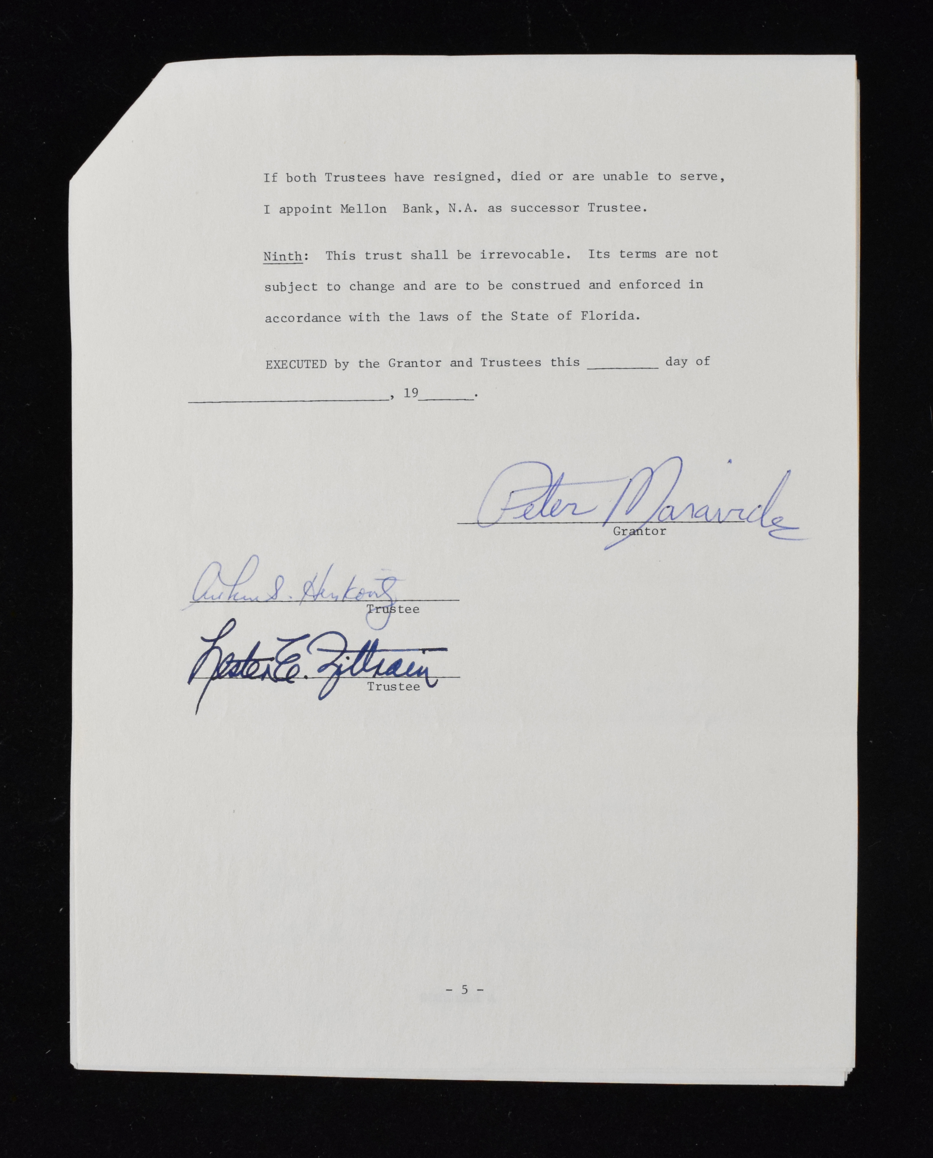 Description:Pete Maravich signed trust agreement, c. 1988 with PSA/DNA LOA (Sig. MT). Non-notarized trust agreement was set up before the Hall of Famer Pete Maravich's untimely death at the age of 40 for the benefit of his son, Jaeson Peter Maravich. Six-page document is an unfiled copy but has been signed on page 5 by two trustees and by Maravich in the rare "Peter Maravich" style, rating 9/10 out of 10. Trust, with original fold lines, appears EX/MT. Includes previous auction house LOA from PSA/DNA. ($500-$1,000)