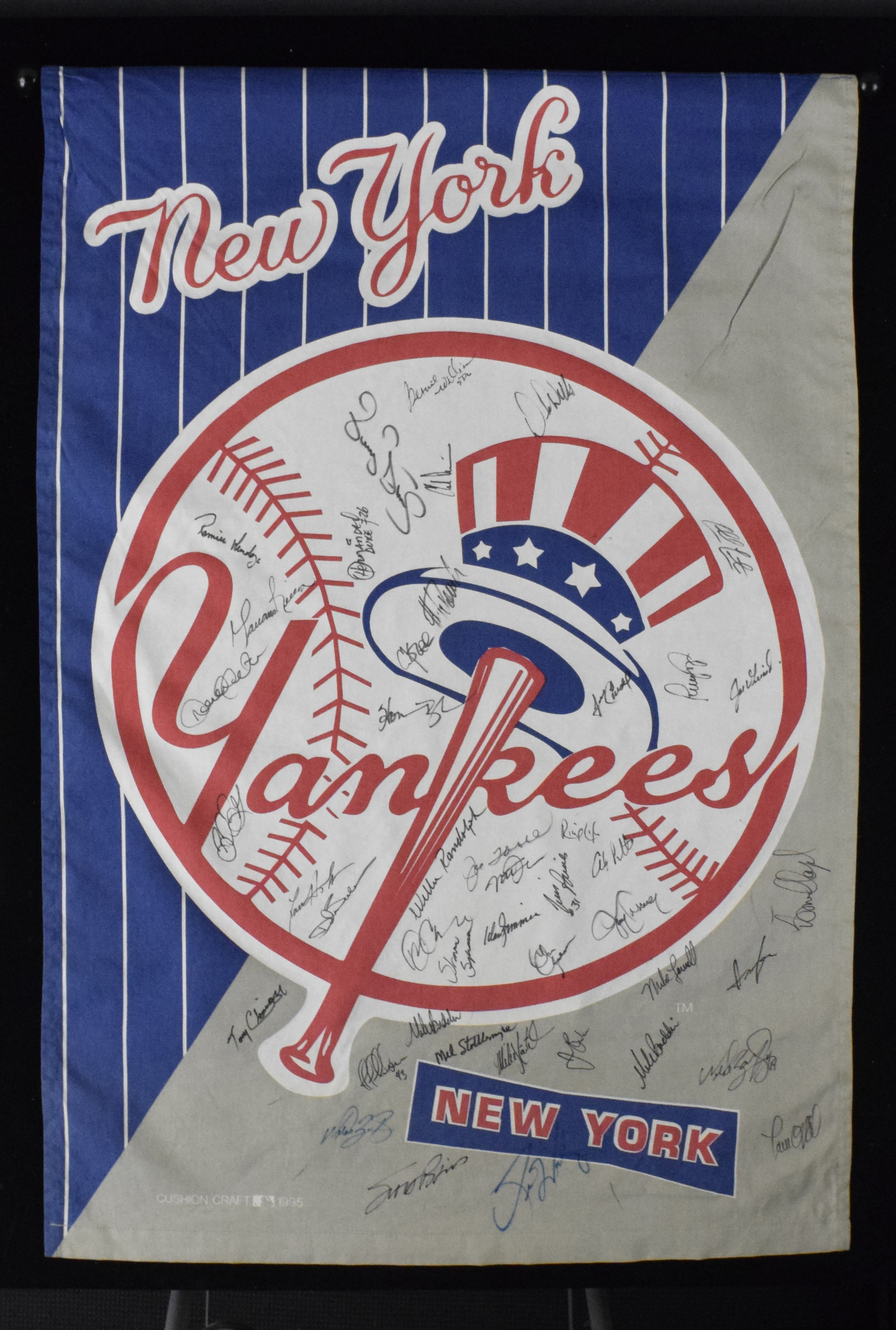 Description:1998 N.Y. Yankees team-signed banner with (44) autos including Jeter, Rivera & JSA LOA (Sigs. NM-MT). Very nice Cushion Craft cloth banner measuring 43"x27" with wooden hanging dowel has been signed in black marker by nearly every member of the 1998 World Series-winning N.Y. Yankees. Key signers include Derek Jeter, Mariano Rivera, Bernie Williams, Joe Torre, Tim Raines, Paul O'Neill, Jorge Posada, Tino Martinez, Darryl Strawberry, David Wells, Joe Girardi, Andy Pettite, Mel Stottlemyre, Don Zimmer, David Cone, Orlando Hernandez, along with many others. Tough-to-assemble group of signatures range from 7 to 9 (avg. 8) and banner (rolled) appears NM. Includes full JSA LOA, with sticker affixed to the letter. ($1,000-$2,000)
