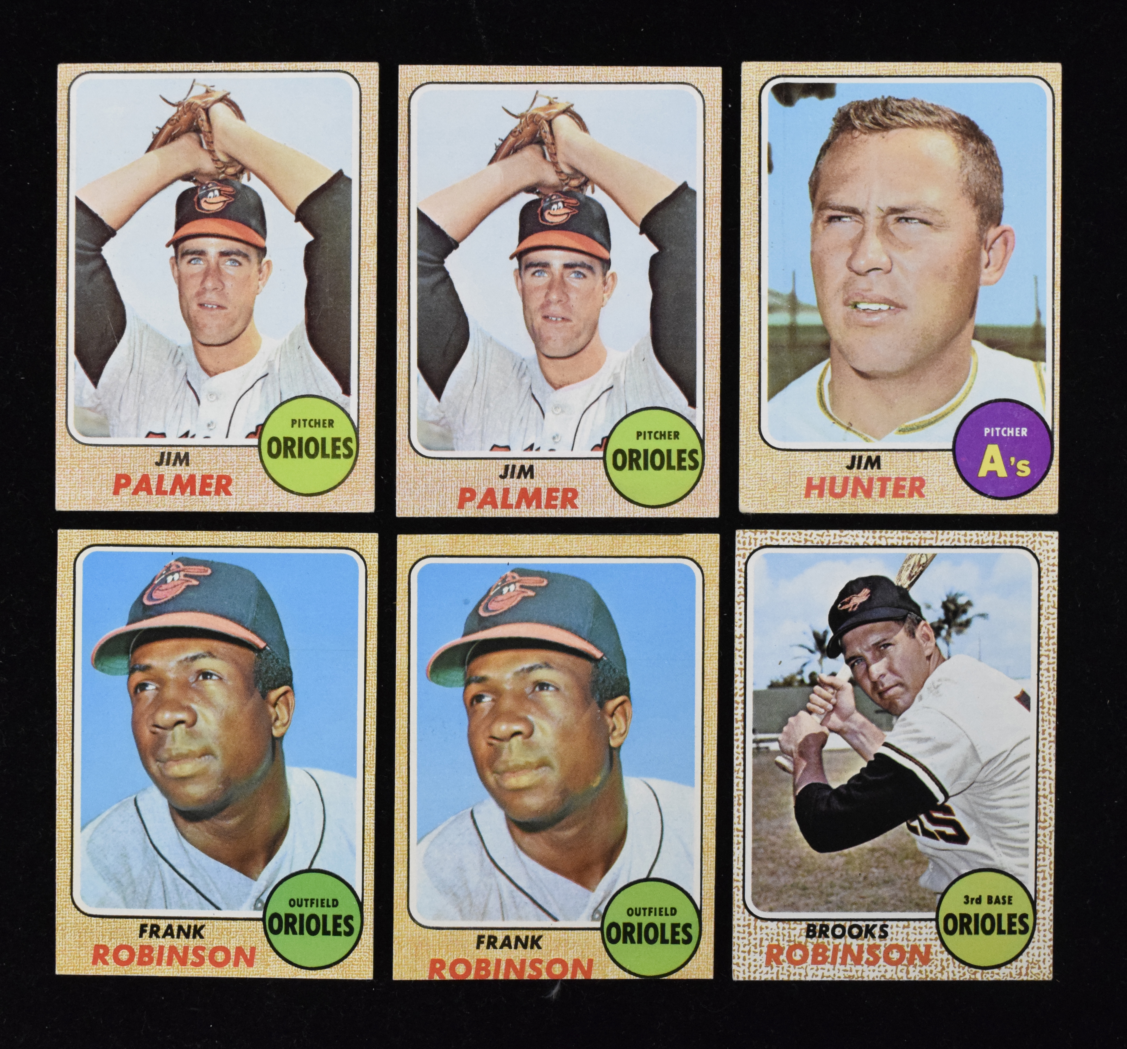 Description:Lot of (250+) 1968 Topps cards with (4) Jim Palmer and (4) Frank Robinson (PR-EX/MT). Excellent quantity of 1968 Topps cards includes low and high numbers, with primarily A's, Orioles and Indians players and moderate to heavy duplication. Lot is highlighted by several stars and Hall of Famers, such as #s 20 Brooks Robinson, (4) 575 Jim Palmer, (4) 500 Frank Robinson, (3) 571 Tony La Russa, 385 Catfish Hunter, (3) 16 Lou Piniella, (2) 532 Luis Tiant and more. Most appear VG/EX-EX with some better and some worse. Range: PR-EX/MT.