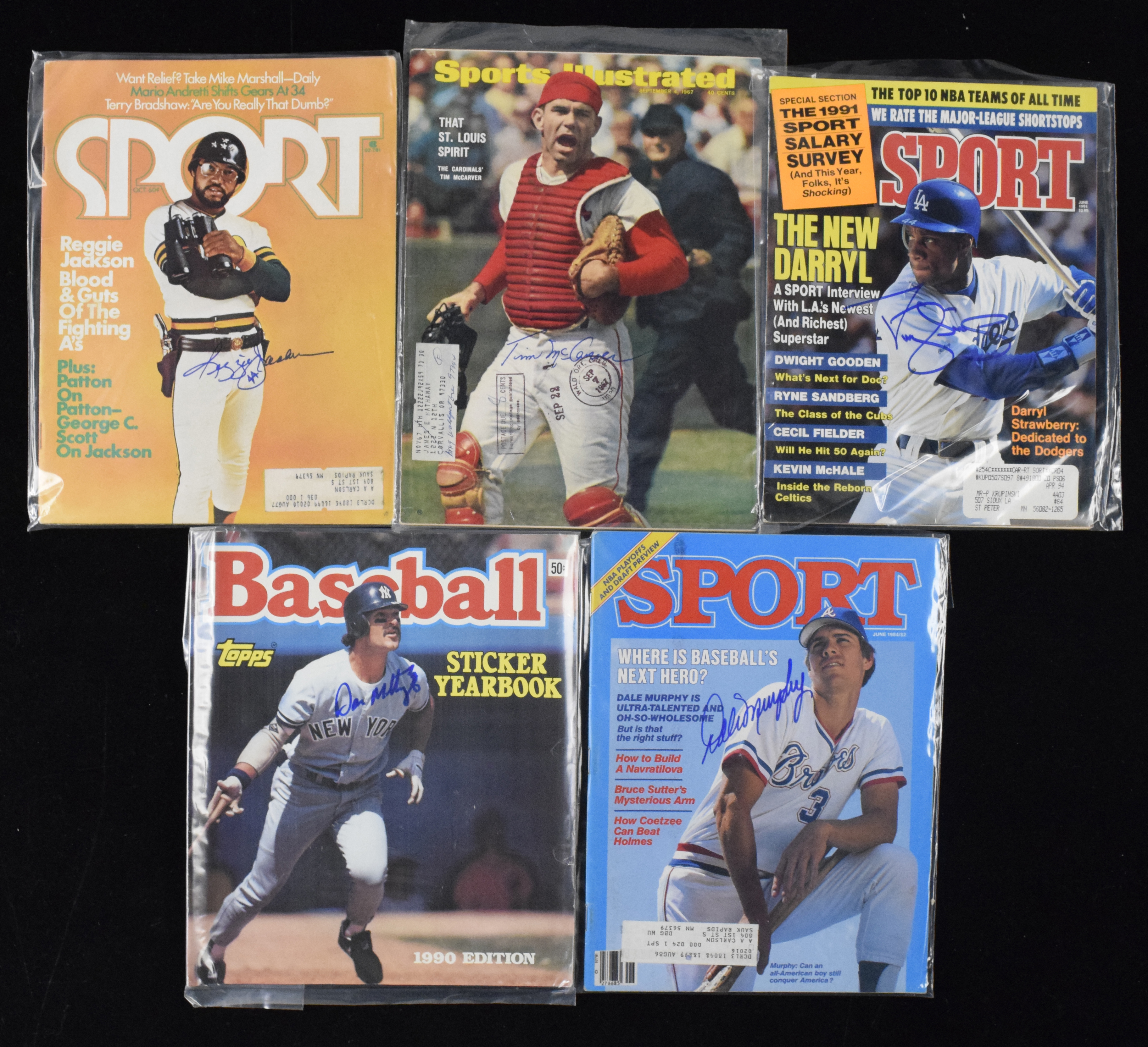 Description:Lot of (5) baseball player autographed magazines, with Don Mattingly and Reggie Jackson (Sigs. MT). Nice assortment of signed 1960s-1990s magazines, including Sport magazine and Sports Illustrated. Magazines are individually signed by Darryl Strawberry, Tim McCarver, Reggie Jackson, Dale Murphy and Don Mattingly. Signatures rate 9/10 out of 10, and magazines range EX-NM.