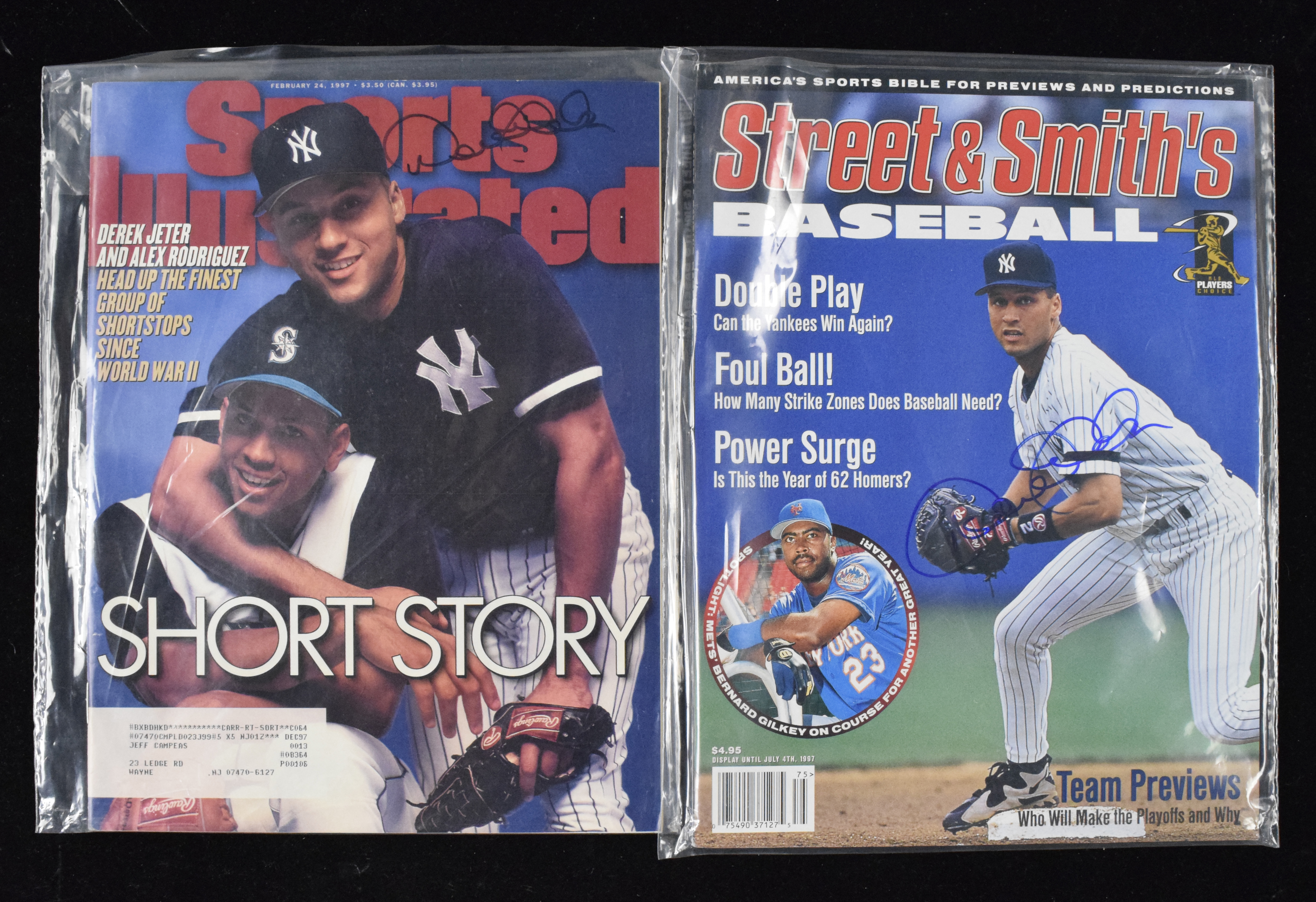 Description:Lot of (2) Derek Jeter autographed 1990s magazines (Sig. NM/MT-MT). Nice lot of magazines signed on the cover by Yankees Hall of Famer Derek Jeter, with (1) Feb. 24, 1997 Sports Illustrated and (1) July 4, 1997 Street & Smith's Baseball. Signatures rate 8/9 out of 10, and magazines appear EX/MT.