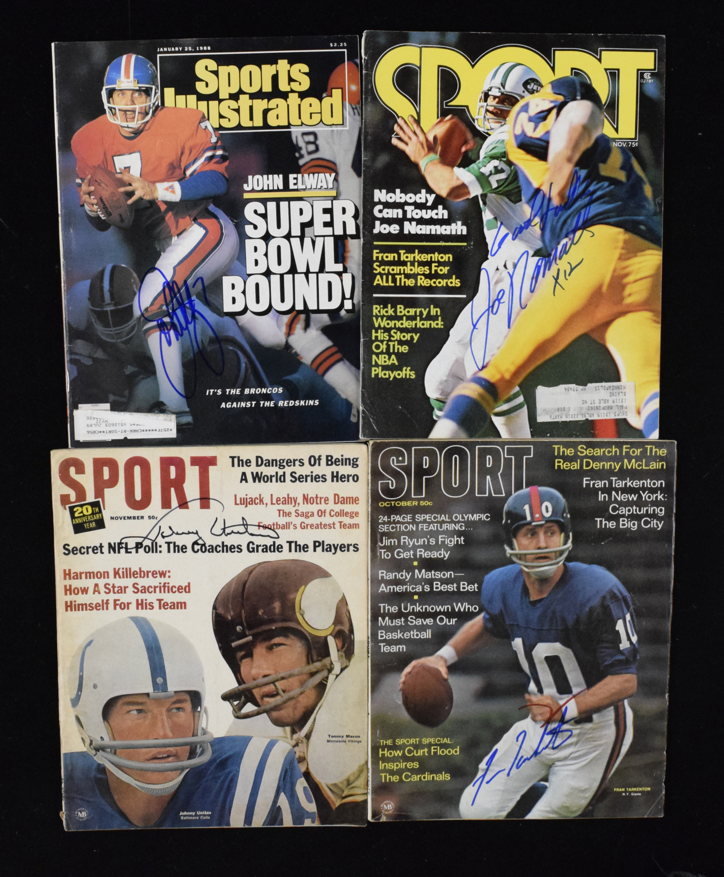 Description:Lot of (4) NFL QB HOFer-autographed magazines, including Namath, Elway and Unitas (Sigs. MT). Nice assortment of magazines, each signed by a Hall of Fame quarterback. Includes (1) 1975 Sport magazine (mailing label affixed) signed by Joe Namath with "12" inscription; (1) 1988 Sports Illustrated (mailing label affixed) signed by John Elway with "7" inscription; (1) 1968 Sport magazine signed by Fran Tarkenton and (1) 1965 Sport magazine signed by Johnny Unitas. Signatures rate 9/10 out of 10, and magazines range VG/EX-EX.