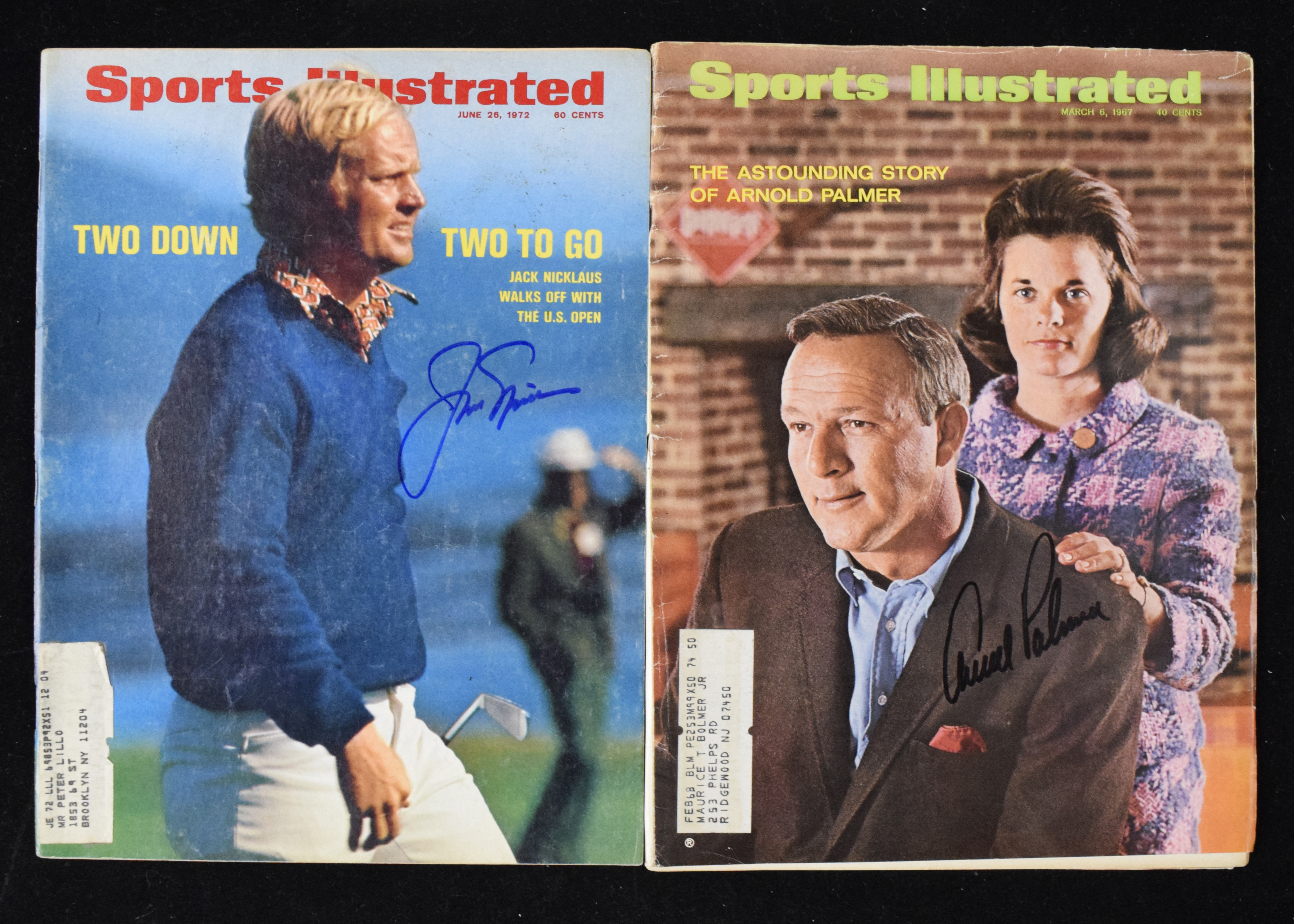 Description:Lot of (2) golfer signed Sports Illustrated magazines, with Jack Nicklaus and Arnold Palmer (Sigs. MT). Nice lot of vintage Sports Illustrated magazines, both with mailing labels affixed. Includes (1) March 6, 1967 issue signed by Arnold Palmer and (1) June 26, 1972 issue signed by Jack Nicklaus. Signatures rate 9 out of 10, and magazines range VG/EX-EX.
