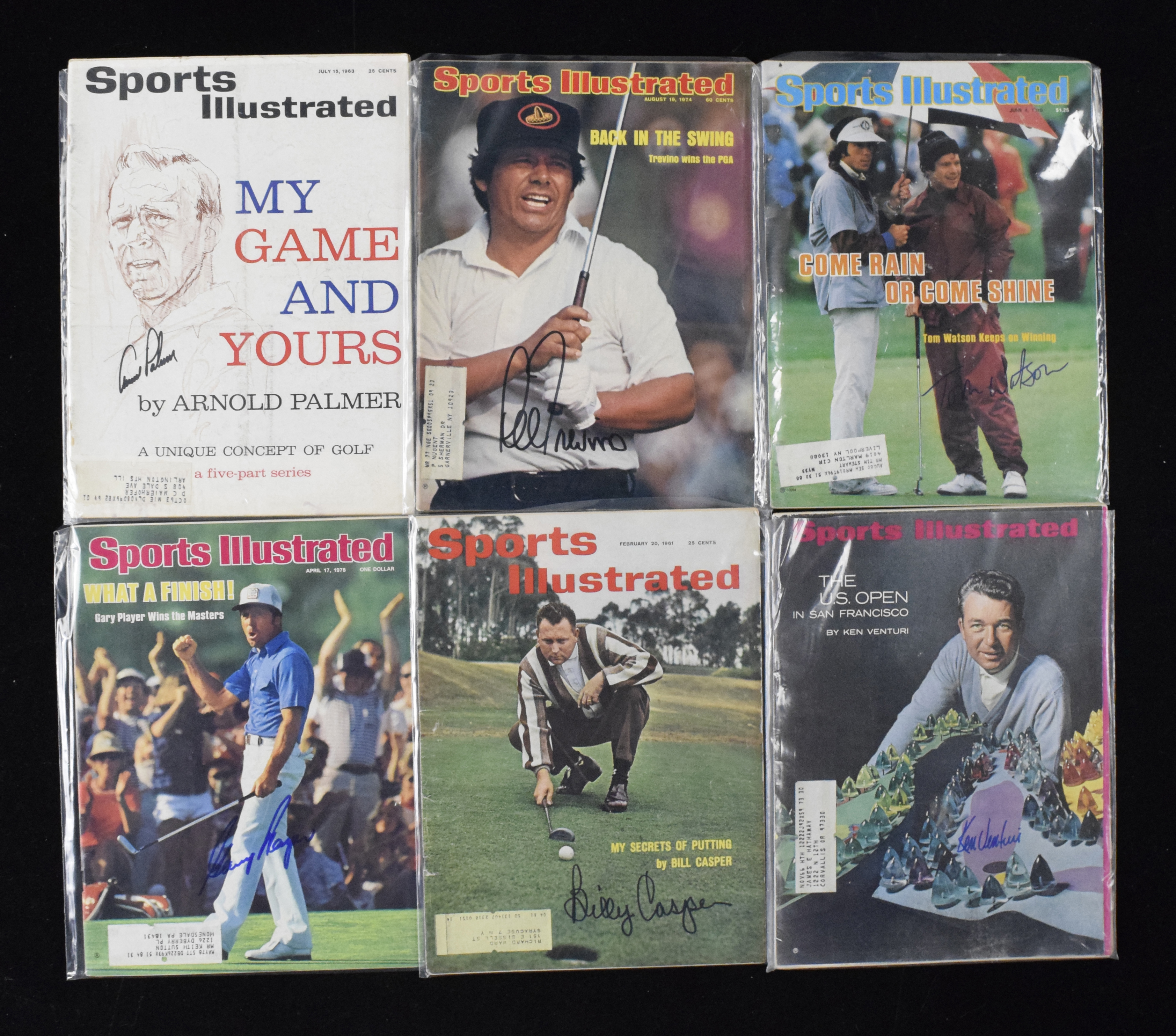 Description:Lot of (6) golfer autographed Sports Illustrated magazines, with Palmer, Player and Trevino (Sigs. MT). Nice assortment of Sports Illustrated magazines, all with mailing labels affixed. Includes (1) July 15, 1963 issue signed by Arnold Palmer; (1) June 13, 1966 issue signed by Ken Venturi; (1) June 4, 1979 issue signed by Tom Watson; (1) Feb. 20, 1961 issue signed by Billy Casper; (1) April 17, 1968 issue signed by Gary Player and (1) Aug. 19, 1974 issue signed by Lee Trevino. Signatures rate 9 out of 10, and magazines range VG-EX/MT.