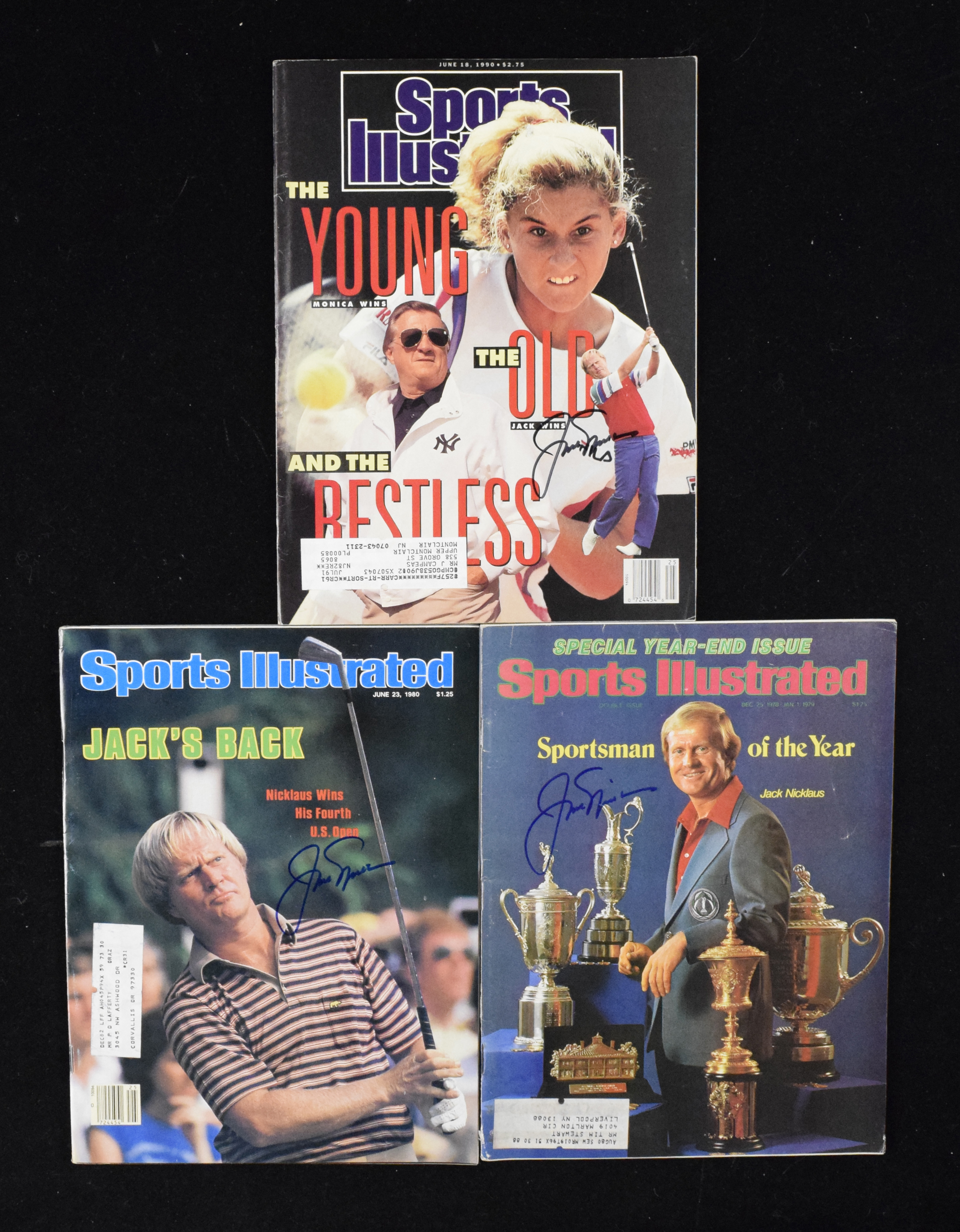 Description:Lot of (3) Jack Nicklaus autographed Sports Illustrated magazines (Sigs. MT). Nice assortment of Sports Illustrated magazines (all with mailing labels affixed), with each issue signed by golf great Jack Nicklaus. Includes (1) June 23, 1980 issue; (1) June 18, 1990 issue and (1) Dec. 25, 1978 issue. Signatures rate 9 out of 10, and magazines range EX-EX/MT.