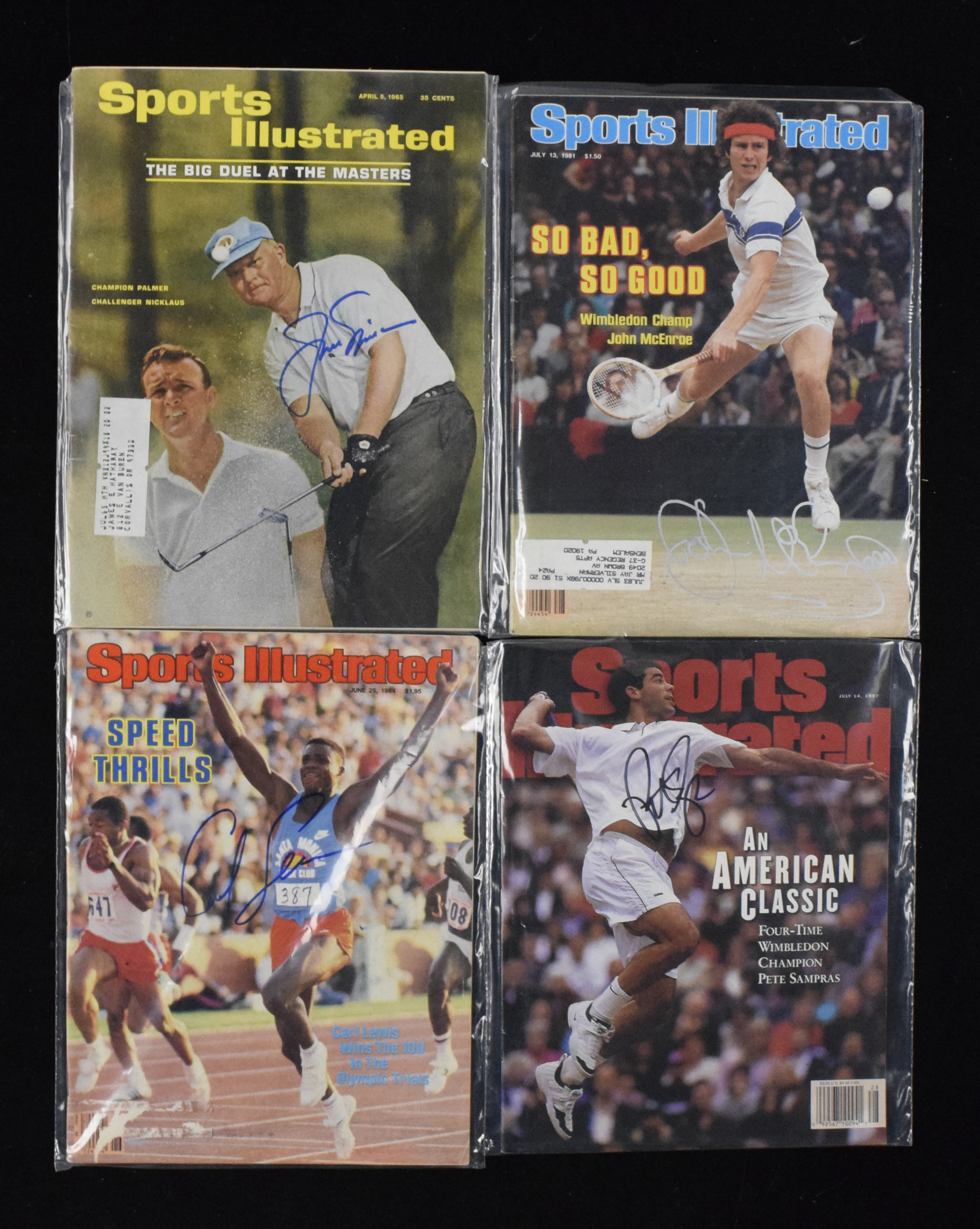 Description:Multi-sport lot of (6) autographed magazines, including Nicklaus, McEnroe and Lewis (Sigs. MT). Multi-sport lot of signed magazines (most with mailing labels affixed or removed) includes (1) June 25, 1984 Sports Illustrated signed by Carl Lewis; (1) 1974 Sport magazine signed by Jimmy Connors; (1) July 14, 1997 Sports Illustrated signed by Pete Sampras; (1) July 13, 1981 Sports Illustrated signed by John McEnroe; (1) June 15, 1981 Sports Illustrated signed by Bjorn Borg; and (1) April 5, 1965 Sports Illustrated signed by Jack Nicklaus. Signatures rate 9 out of 10, and magazines range VG/EX-EX/MT.