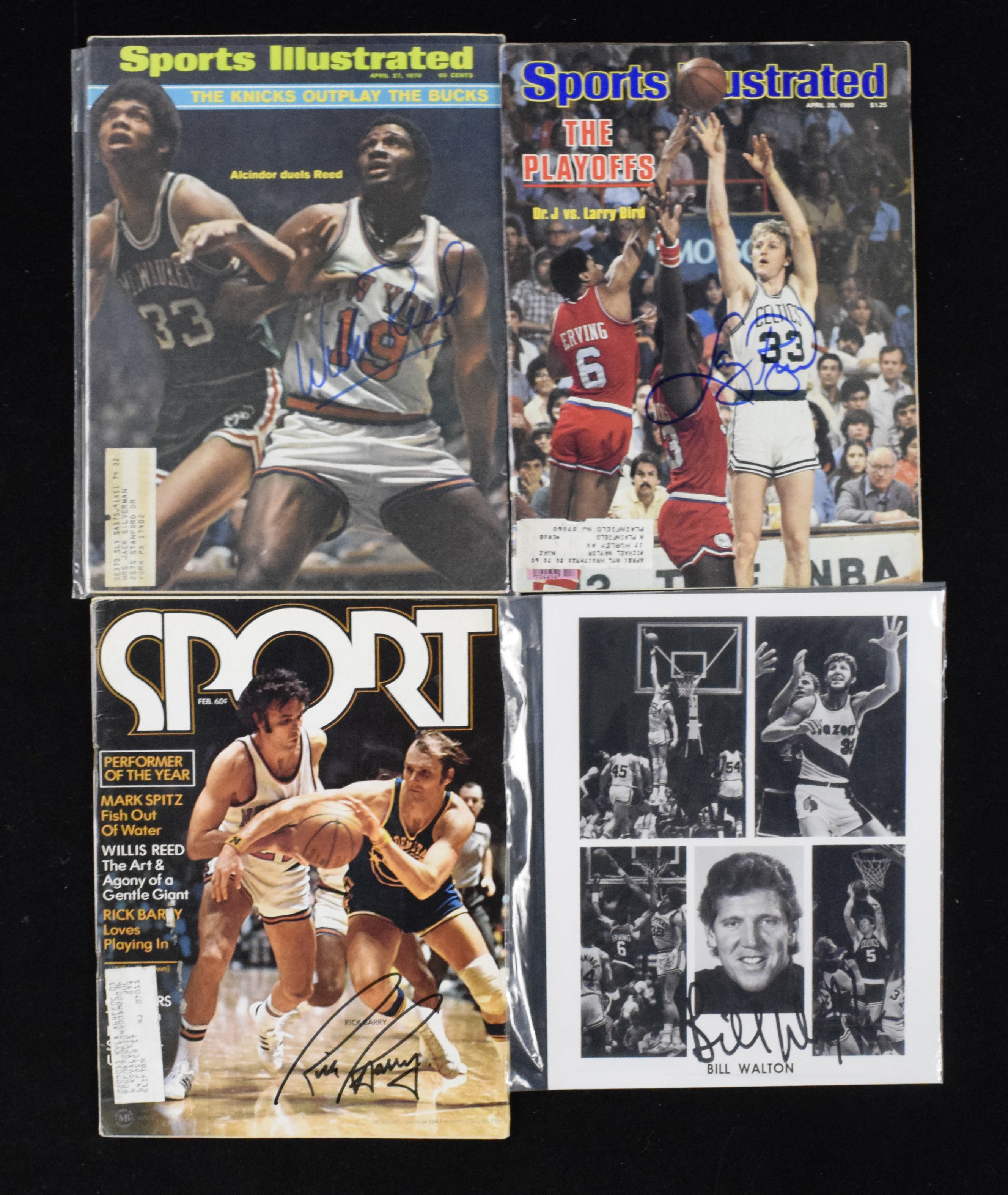 Description:Lot of (7) basketball HOFer autographed magazines and photos, with Bird, Walton and Reed (Sigs. MT). Nice assortment of basketball Hall of Famer signed items, with (4) magazines (most with mailing labels affixed): (1) 1973 Sport magazine signed by Rick Barry; (1) April 28, 1980 Sports Illustrated signed by Larry Bird; (1) 2007 NBA Finals program signed by Bill Walton; and (1) April 27, 1970 Sports Illustrated signed by Willis Reed. Also includes (3) B&W 8"x10" photos individually signed by Billy Walton. Signatures rate 9/10 out of 10 and magazines/photos range VG-EX-NM.