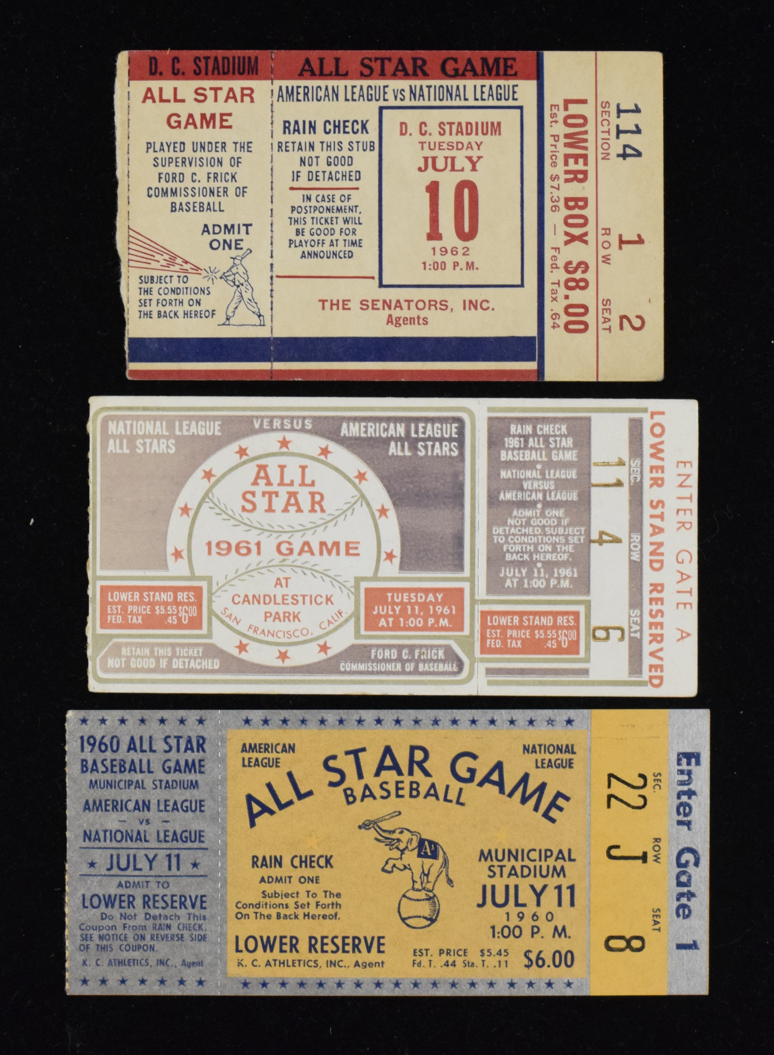 Description:Lot of (3) 1960-1962 MLB All-Star Game ticket stubs (VG-VG/EX). Nice lot of original All-Star Game ticket stubs, with (1) 1960 from Municipal Stadium (VG/EX); (1) 1961 from Candlestick Park (VG/EX) and (1) 1962 from D.C Stadium (VG). Range: VG-VG/EX.