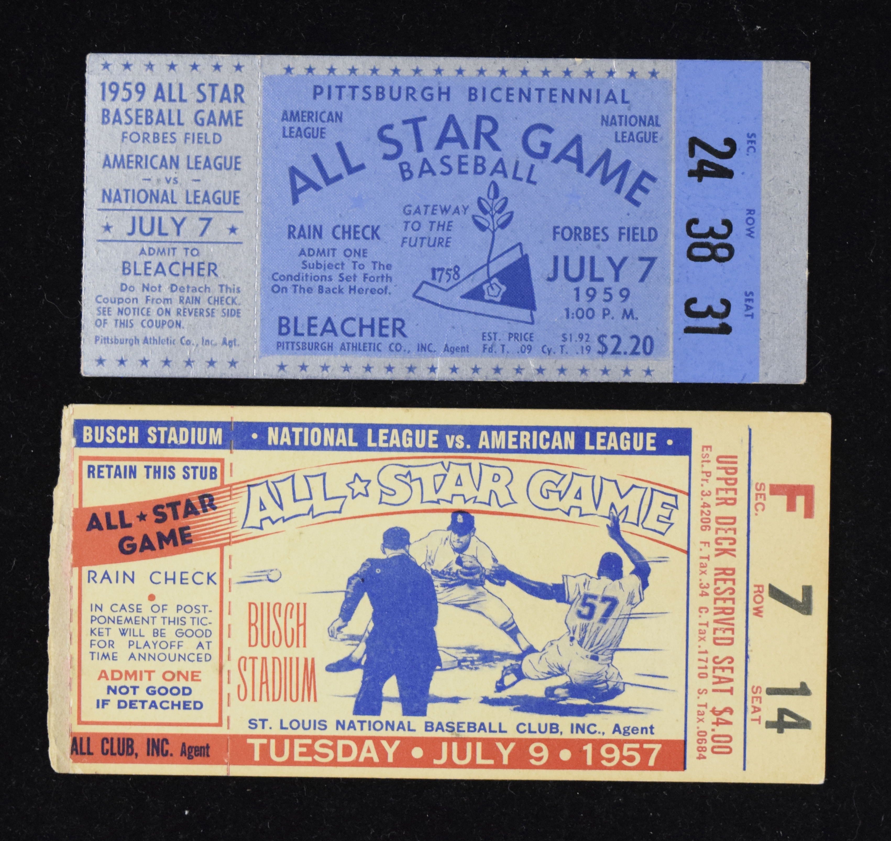 Description:Lot of (2) MLB All-Star Game ticket stubs, with 1957 and 1959 (GD-VG). Nice lot of original All-Star Game ticket stubs, with (1) 1957 from Busch Stadium (VG) and (1) 1959 from Forbes Field (GD). Range: GD-VG.