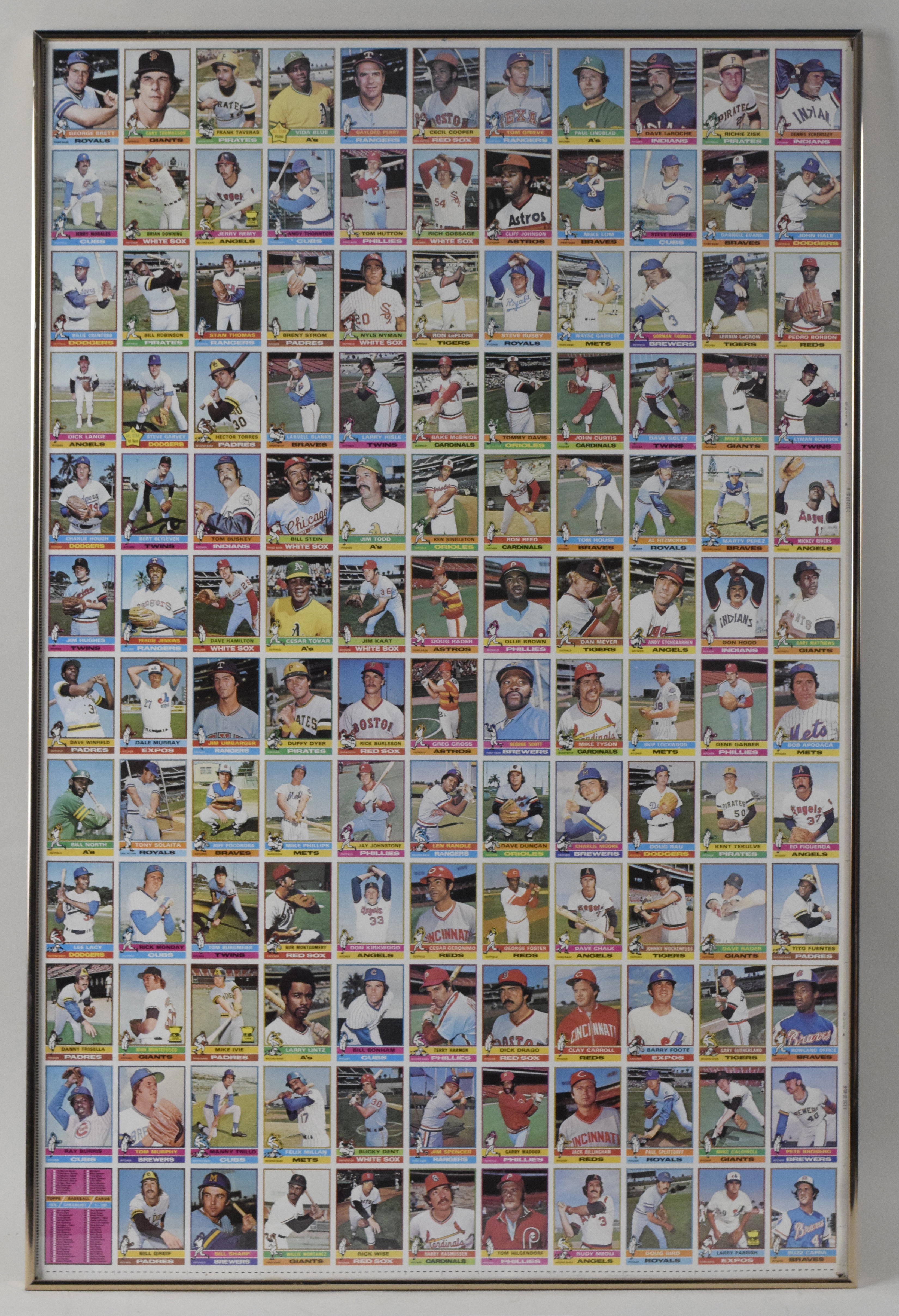 Description:1976 Topps Baseball uncut sheet with HOFers including Eckersley rookie (GD-NM framed). Approx. 28.5"x43" framed 132-card sheet including Dennis Eckersley rookie, Gaylord Perry, George Brett, Dave Winfield, Fergie Jenkins, Jim Kaat, Rich Gossage, Bert Blyleven, and others. Due to framing, complete conditions are unknown. Some wear can be seen at some of the edge and corner cards (including Eckersley), but most interior cards appear fairly high grade: GD-NM