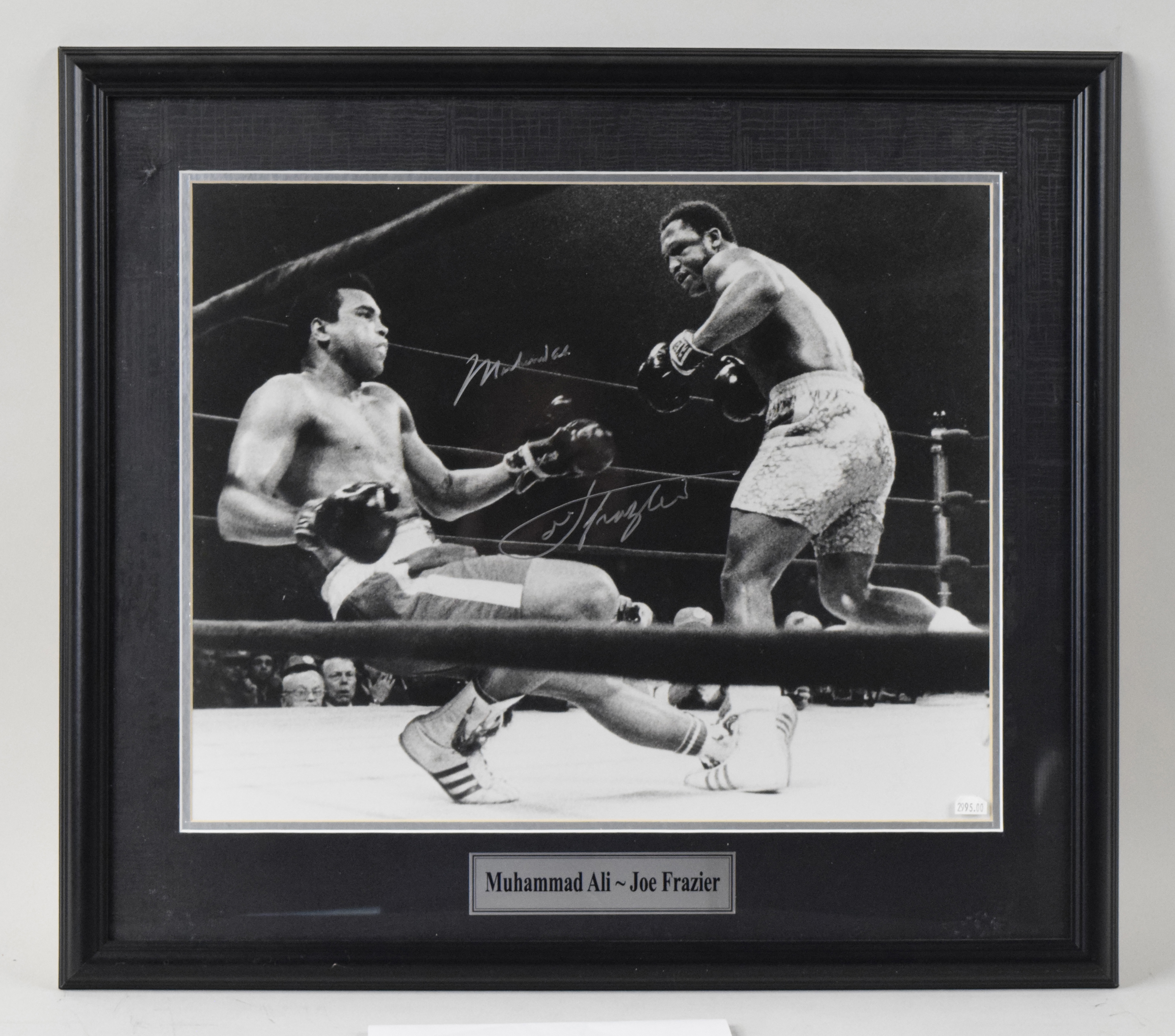 Description:Muhammad Ali and Joe Frazier dual-signed oversize framed photograph (NM). Frame measures approx. 23"x26". Frazier and Ali both signed the photo in silver marker. Signatures rate 8 to 9 out of 10. Due to framing, complete condition is unknown (plexiglass has wear near the top left corner but matting appears unharmed). Photo: NM appearance ($500-$750)