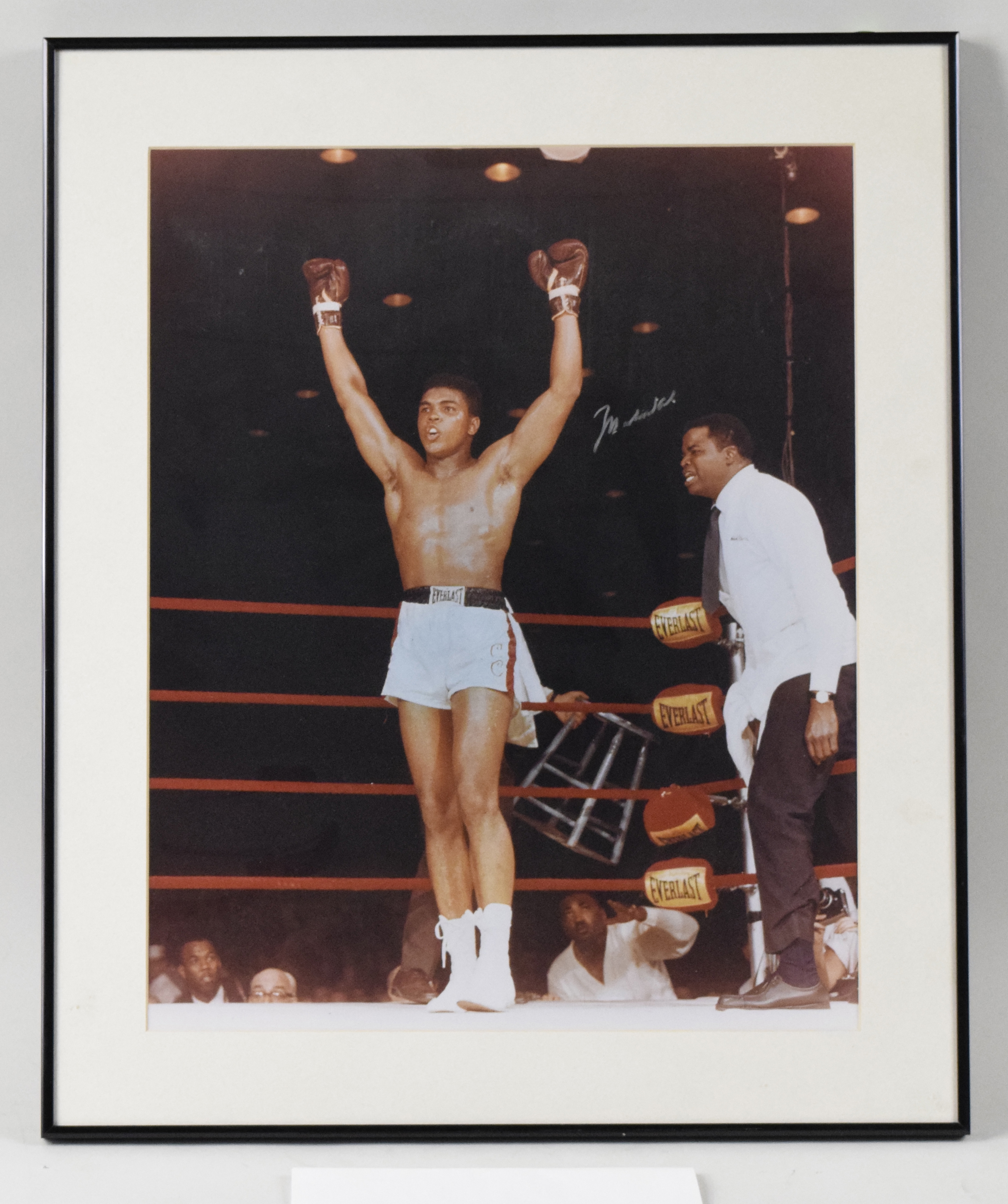 Description:Muhammad Ali autographed oversize framed photograph (NM). Frame measures approx. 20"x24". Ali signed the photo in silver marker. Signature rates 8 out of 10. Due to framing, complete condition is unknown: NM appearance ($400-$600)