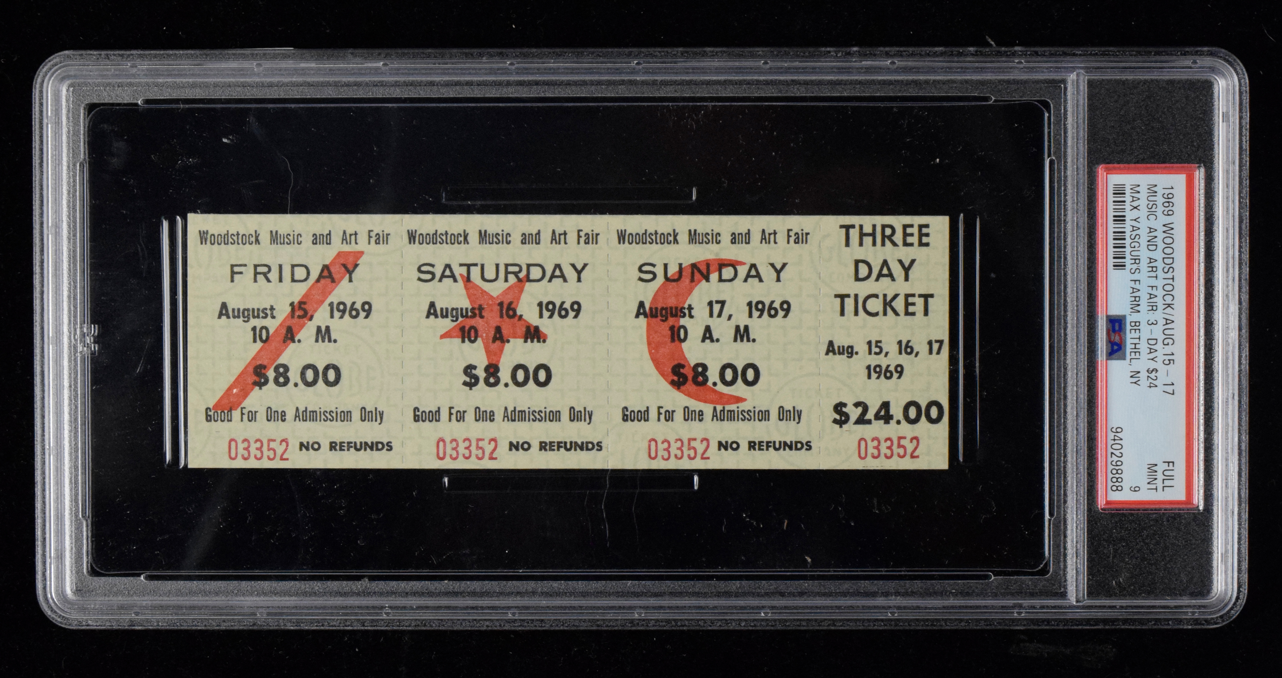 Description:1969 Woodstock full (3) day ticket (August 15-17) (PSA Mint 9) High grade ticket showing no mentionable wear: PSA Mint 9