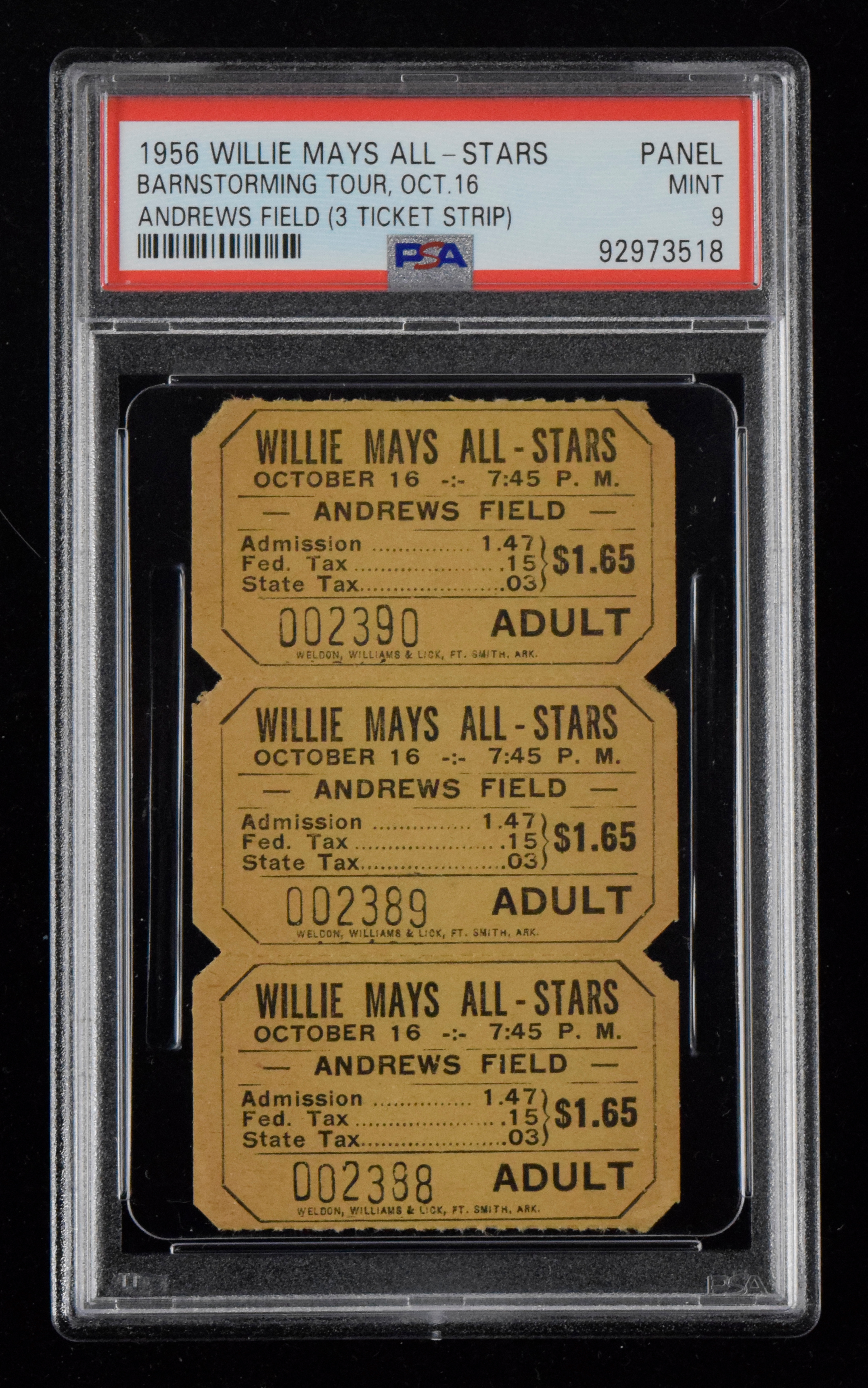 Description:October 16, 1956 Wllie Mays All-Stars strip of (3) tickets (PSA Mint 9 - highest graded) Strip of (3) tickets issued for the barnstorming game which saw the Mays All-Star Team play a team of Negro League players. No mentionable wear and there are none graded higher by PSA: PSA Mint 9