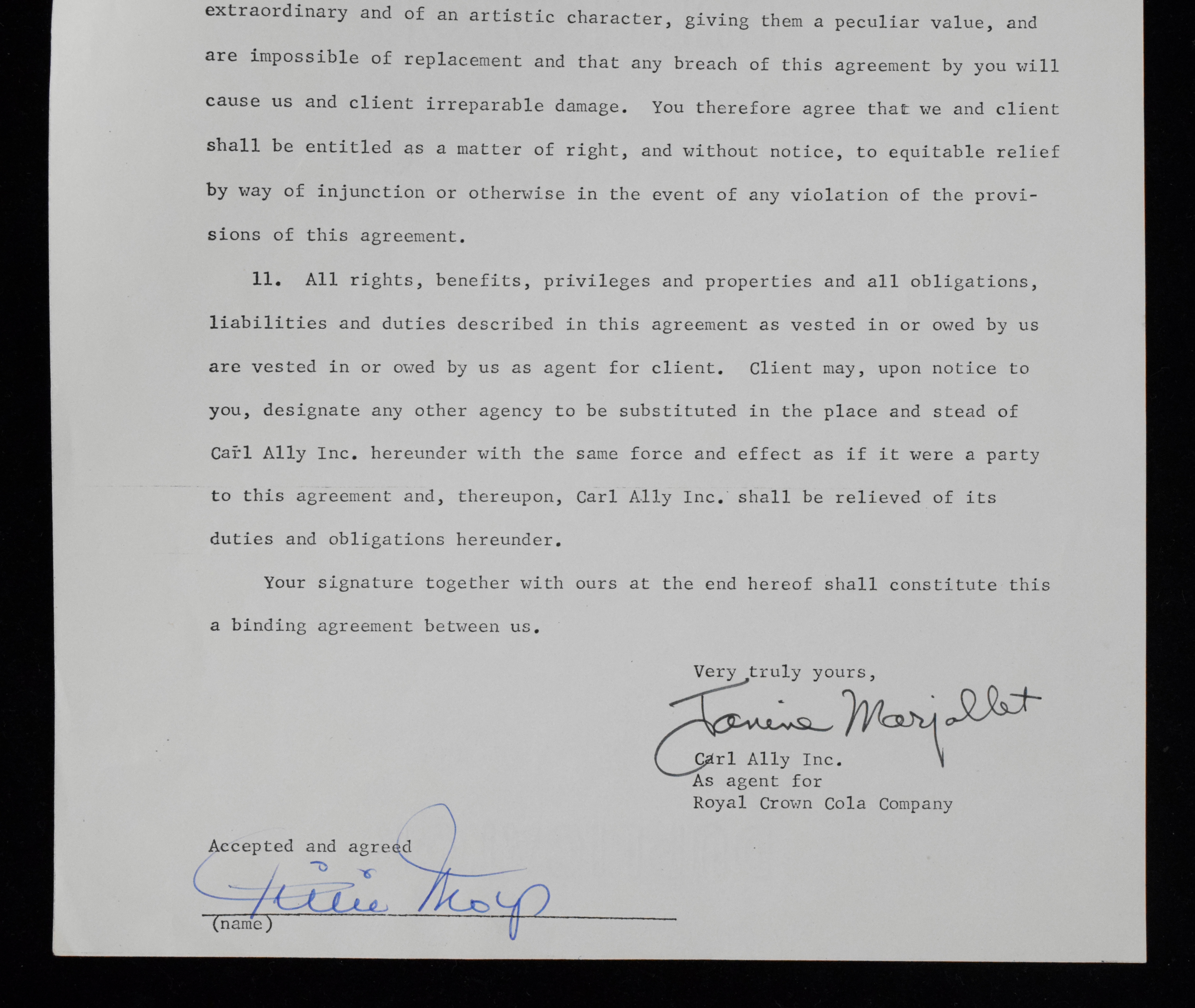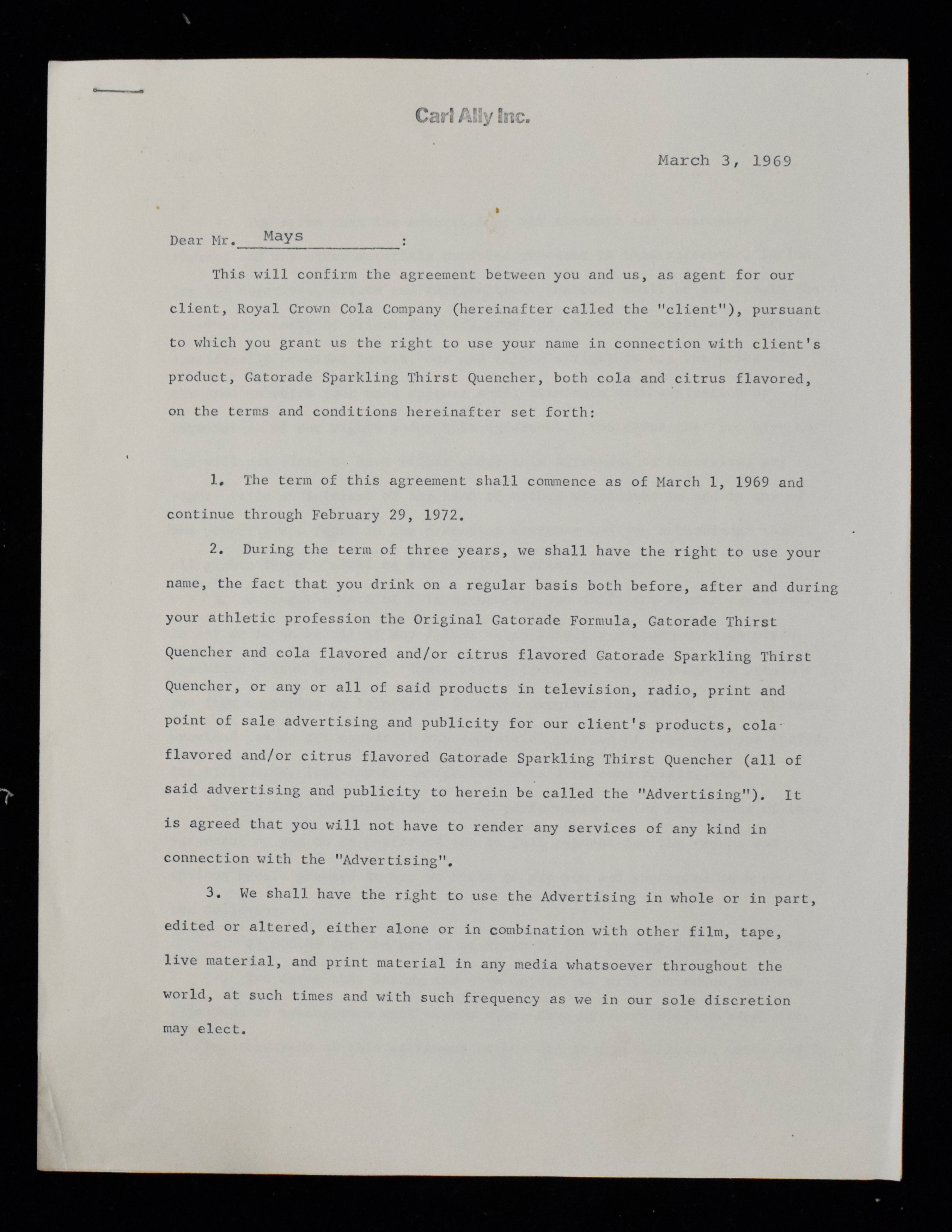 Description:1969 Willie Mays autographed Gatorade contract (Sig. NM, Contract VG) March 3, 1969 dated (4) page agreement has been signed "Willie Mays" in ink rating 8-8/9 out of 10. Content relates to his being involved in the promotion of Gatorade which had been introduced to the market just a few years prior. Pages are stapled together and show a touch of light wear. Includes certificate of provenance from the Willie Mays Collection: EX-NM ($400-$600)