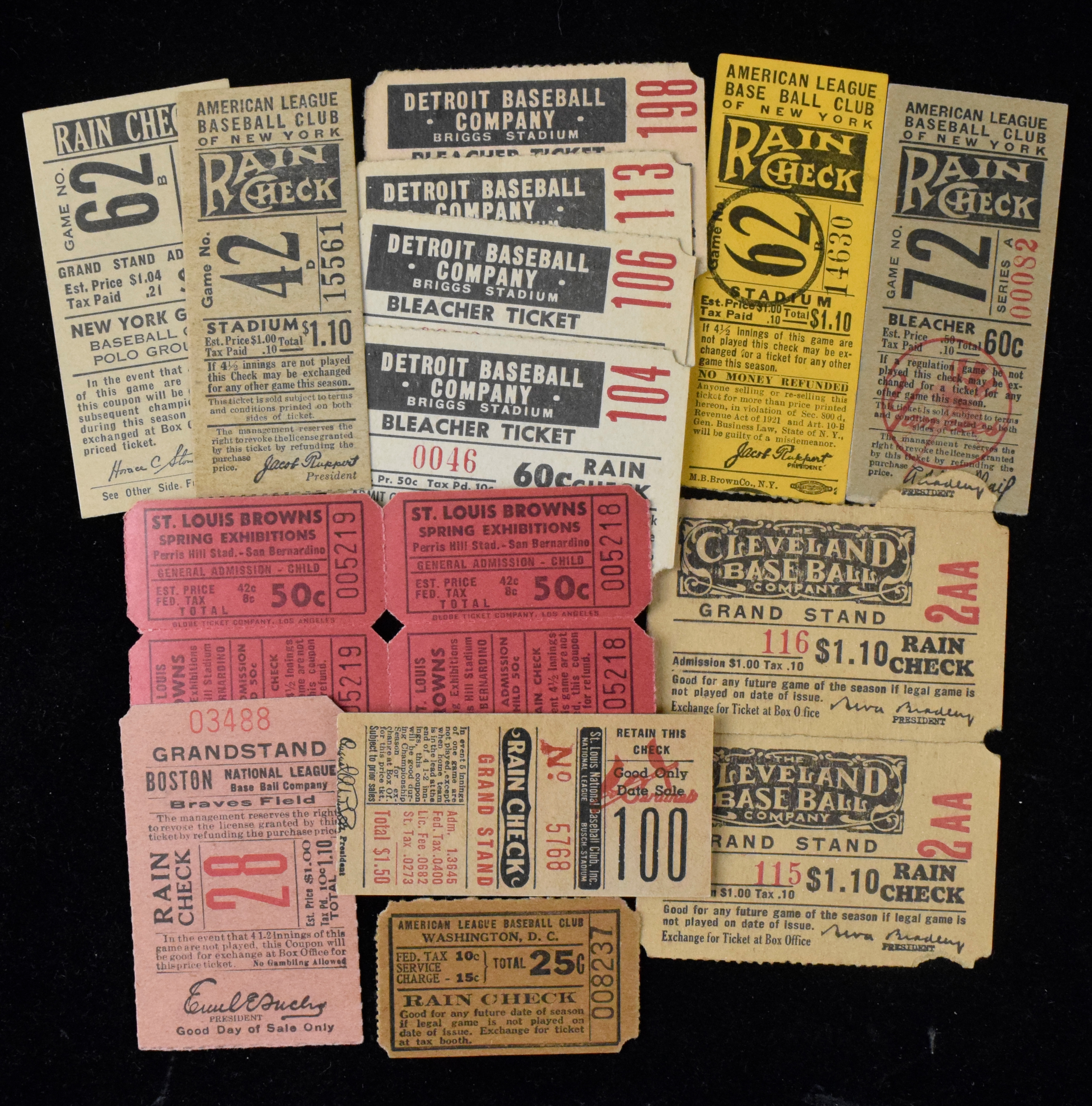 Description:Lot of (15) c.1920s-40s baseball game tickets and stubs (GD-EX) Nice of undated tickets and stubs which are both "normal" format and a portion are carnival style tickets. Includes (3) New York Yankees (1 from Larry MacPhail's time with the team, 2 Jacob Ruppert); (4) Detroit Tigers bleacher tickets (Walter O Briggs); 1934 Boston Braves (game "28"); New York Giants (Horace Stoneham); (2) Cleveland Indians grandstand tickets (Alva Bradley); St. Louis Cardinals stub (August Busch); Washington Senators; and (2) for a St. Louis Browns Spring Exhibition game. Varying degrees/types of wear throughout: GD-EX