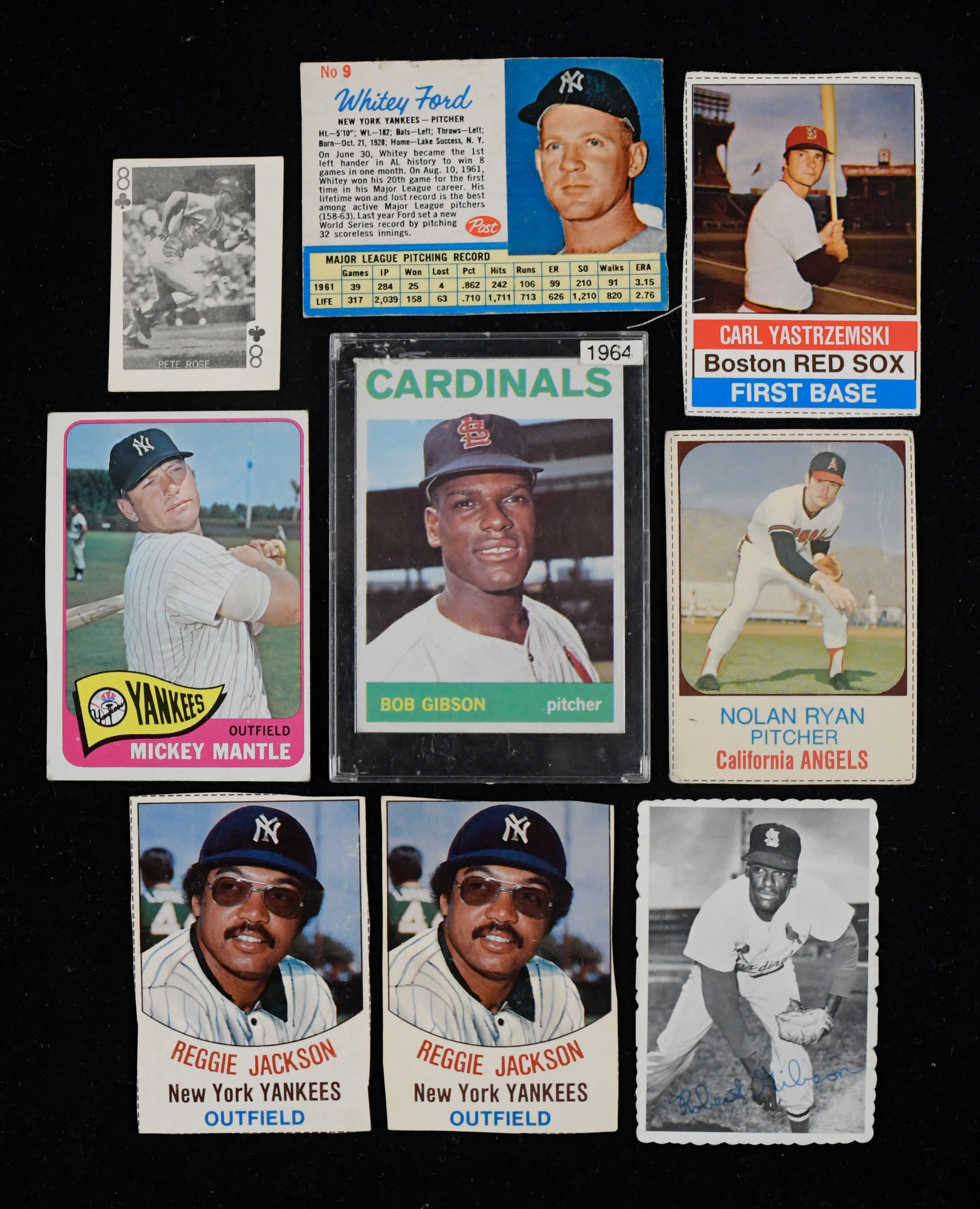 Description:Lot of (275+) vintage baseball cards with 1965 Mantle and many Hall of Famers (FR-EX) Includes 1962 Post Whitey Ford (FR); 1962 Topps Casey Stengel and Tom Tresh along with some additional 1960s Yankees Topps cards; 1964 Topps Bob Gibson; 1965 Topps Mickey Mantle (GD); 1968 Topps Willie Stargell; 1969 Topps Frank Robinson; 1971 Topps Bob Gibson; (4) 1964 Topps Giants commons; (16) 1969 Topps Deckle Edge incl. Pete Rose (miscut), Carl Yastrzemsk (miscut), Bob Gibson, Rod Carew, and Willie McCovey. These average VG (with note to some miscuts); (52) 1969 Globe Imports playing cards incl. Ernie Banks, Pete Rose, Don Drysdale, Tom Seaver, Harmon Killebrew, Frank Robinson, Bob Gibson, Lou Brock, Willie Mays, and Al Kaline. These average VG/EX-EX; 1975 Hostess Nolan Ryan (FR); (92) 1977 Hostess cards (many inlow grade condition, staining/discoloration, and while better overall others may have an issue with the cut being jagged or inside the lines) with notables incl. Reggie Jackson (2), Jim Palmer, Catfish Hunter, Carlton Fisk, Lou Brock, Willie Stagell, Thurman Munson, and Johnny Bench; (60) 1976 Hostess with portions low grade and/or having a very poor cut. Notables incl. Carlton Fisk, Robin Yount, Johnny Bench, Pete Rose, Carl Yastrzemski, Jim Rice, and (2) Catfish Hunter; 1950s-70s America Tract Society Bobby Richardson (GD); and some additional cards (more modern are not included in overall estimated quantity). Varying degrees/types of wear throughout with large portions in low grade however there are some better mixed in.