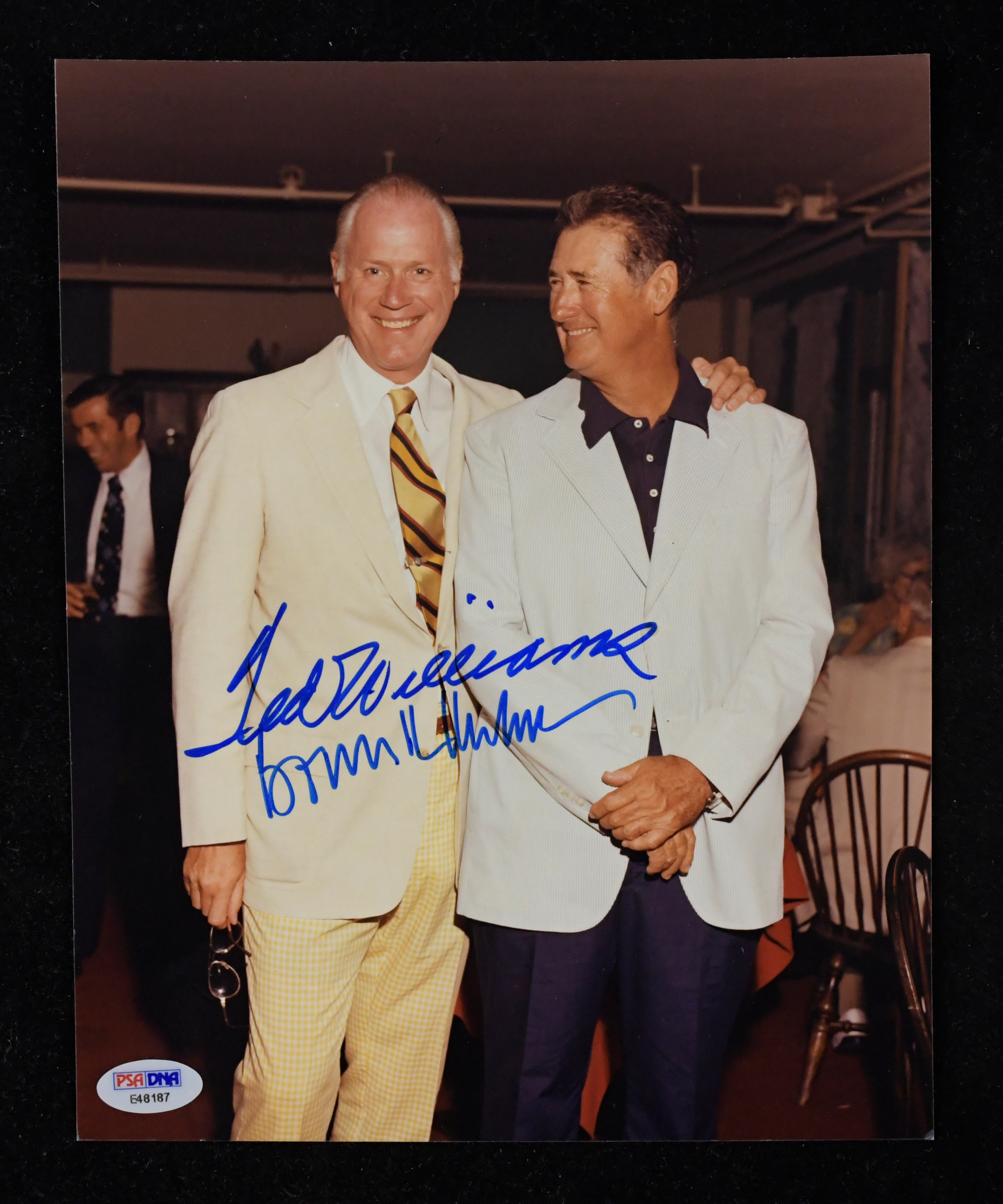 Description:Ted Williams and Bowie Kuhn dual-signed 8"x10" photograph - PSA/DNA (NM). Williams and Kuhn both signed the photo in blue marker. Signatures rate 9 to 10 out of 10. Includes LOA from PSA/DNA, with matching serial #ed sticker on the photo: NM