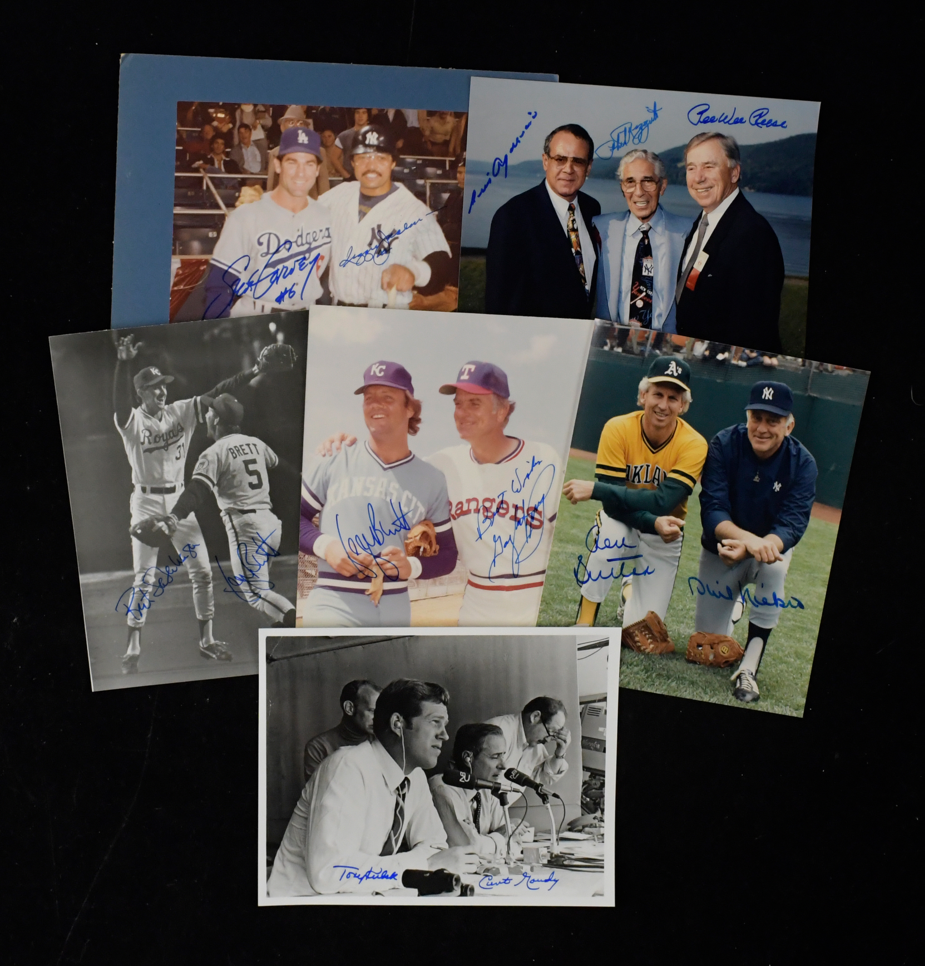 Description:Lot of (6) photographs multi-signed by baseball stars and HOFers (EX-NM/MT). Includes 8"x10" photo dual-signed by Phil Niekro and Don Sutton; 8"x10" photo multi-signed by Pee Wee Reese, Phil Rizzuto, and Luis Aparicio; 8"x10" photo dual-signed by Gaylord Perry and George Brett; 6.5"x9" photo dual-signed by Reggie Jackson and Steve Garvey (on 9"x12" matting which has corner wear); 8"x10" photo dual-signed by George Brett and Bret Saberhagen; 8"x10" photo dual-signed by Tony Kubek and Curt Gowdy. Signatures rate 8 to 10 out of 10: EX-NM/MT