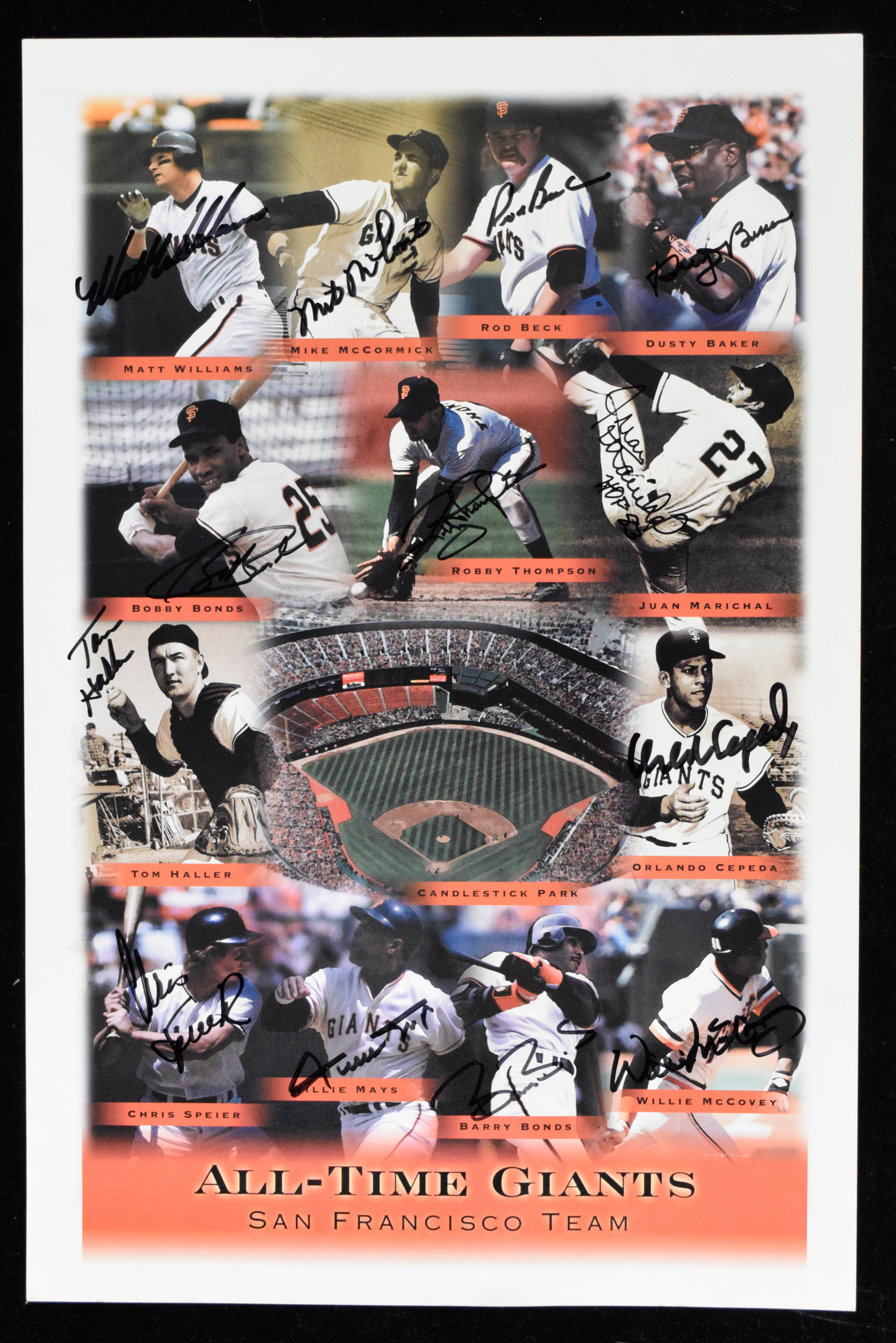 Description:"All-Time Giants" poster autographed by (13) incl. Mays and Bonds. Nicely done on 13"x19" glossy signed and stock by all pictured including Willie Mays, Barry Bonds, Willie McCovey, Chris Speier, Orlando Cepeda, Tom Haller, Juan Marichal, Robby Thompson, Bobby Bonds, Dusty Baker, Rod Beck, Mike McCormick, and Matt Williams. All are done in marker rating 8 out of 10 or better. Touch of light would have little effect when matted and framed for display however there is a horizontal line/impression along the bottom which would remain visible. Includes certificate of provenance from the Willie Mays Collection: Sigs. NM, Poster EX ($300-$500)
