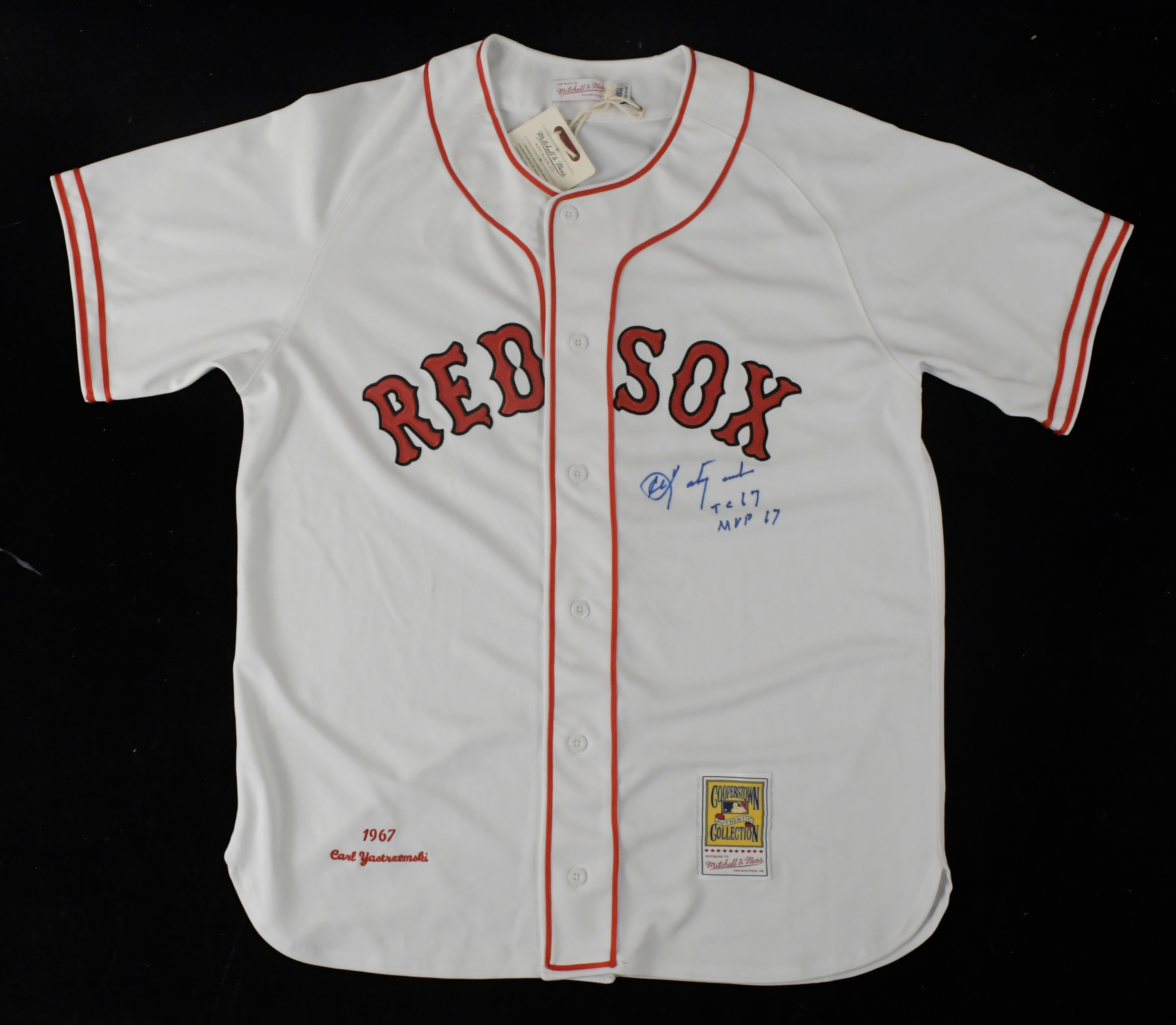Description:Carl Yastrzemski signed and inscribed Boston Red Sox throwback jersey (NM). Mitchell & Ness "Cooperstown Collection" size 48 (XL) Red Sox #8 Carl Yastrzemski 1967 style jersey signed by Yastrzemski in blue marker with "TC 67" "MVP 67" inscriptions. Signature rates 8 out of 10: NM