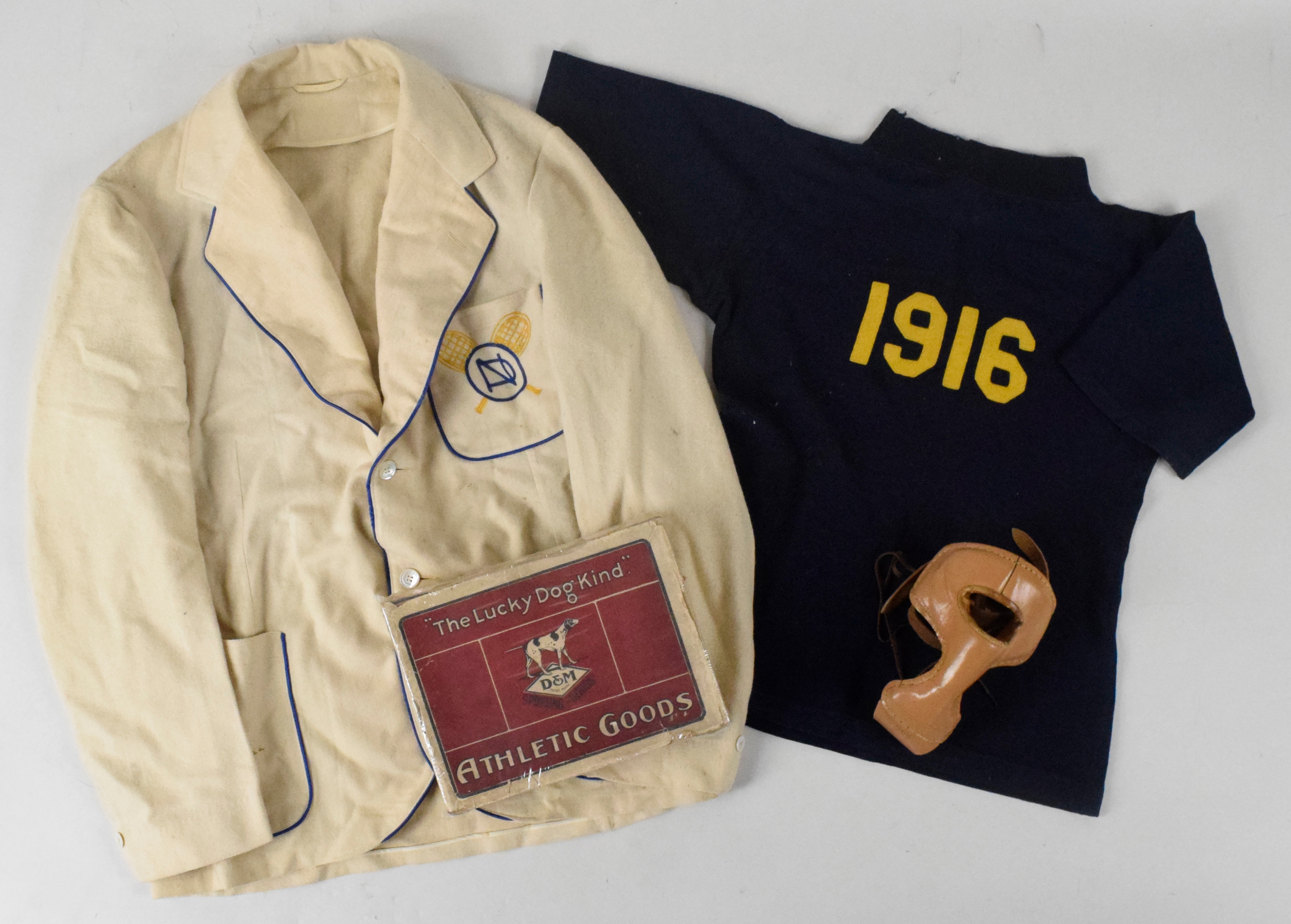 Description:Large lot of assorted sports memorabilia and equipment (FR/GD-NM). Highlights include a "1916" sweater (appears to be youth), c.1920s-30s D&M Sporting Goods empty display box, c.1920s-30s approx. 25"x62" Stanford banner, c.1930s-40s West End Sportwear jacket with "ND" embroidered over tennis racket designs, c.1940s MacGregor model 4NG leather nose guard, c.1940s-50s Blue Island High School letterman sweater with baseball and football patches, and many other items (6 tubs/boxes full of memorabilia and equipment). Various conditions throughout the lot. Most items appear to average VG/EX overall. Range: FR/GD-NM