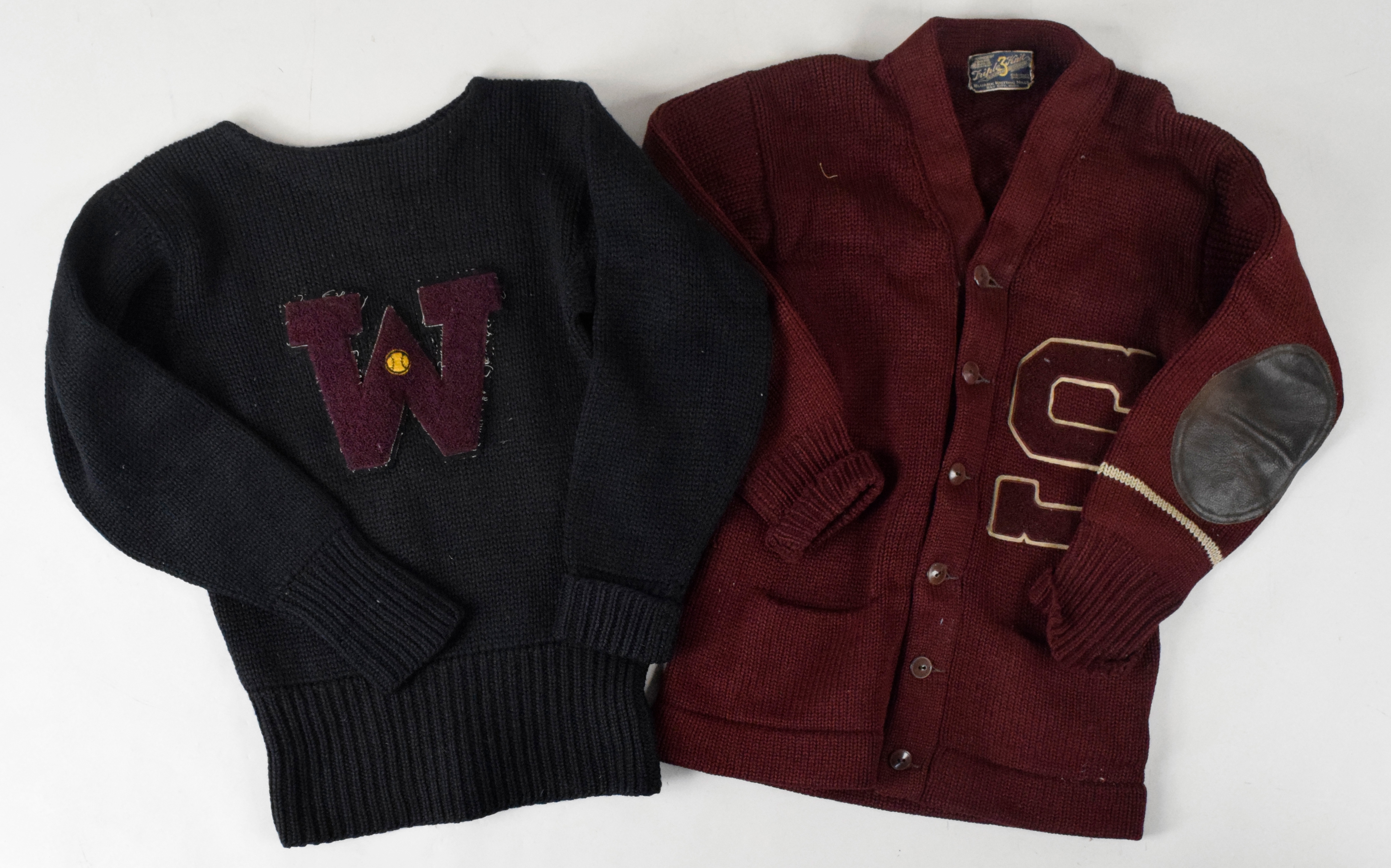 Description:Lot of (7) vintage letterman sweaters (VG-EX/MT). Includes untagged crimson sweater with green "SC" patch (VG green felt wearing away); Bluark Knitting Mills burgundy sweater with white-trimmed burgundy "S" patch; Kandel Knitting Mills red sweater with white-trimmed "S" patch which has small swimming patch; Yorkshire Clothes cream colored sweater with purple "S" patch which has small football patch and "54"; Bill Hatch black sweater with orange "T" patch which has small baseball, basketball, and football patches, along with "Don" on the right sleeve, and "D. Miler" above the collar tag; Puritan Sportswear black sweater with red "T" patch which has a small basketball patch and "52"; Square See black sweater with burgundy "W" patch which has a small baseball patch. Most appear to average EX overall. Range: VG-EX/MT