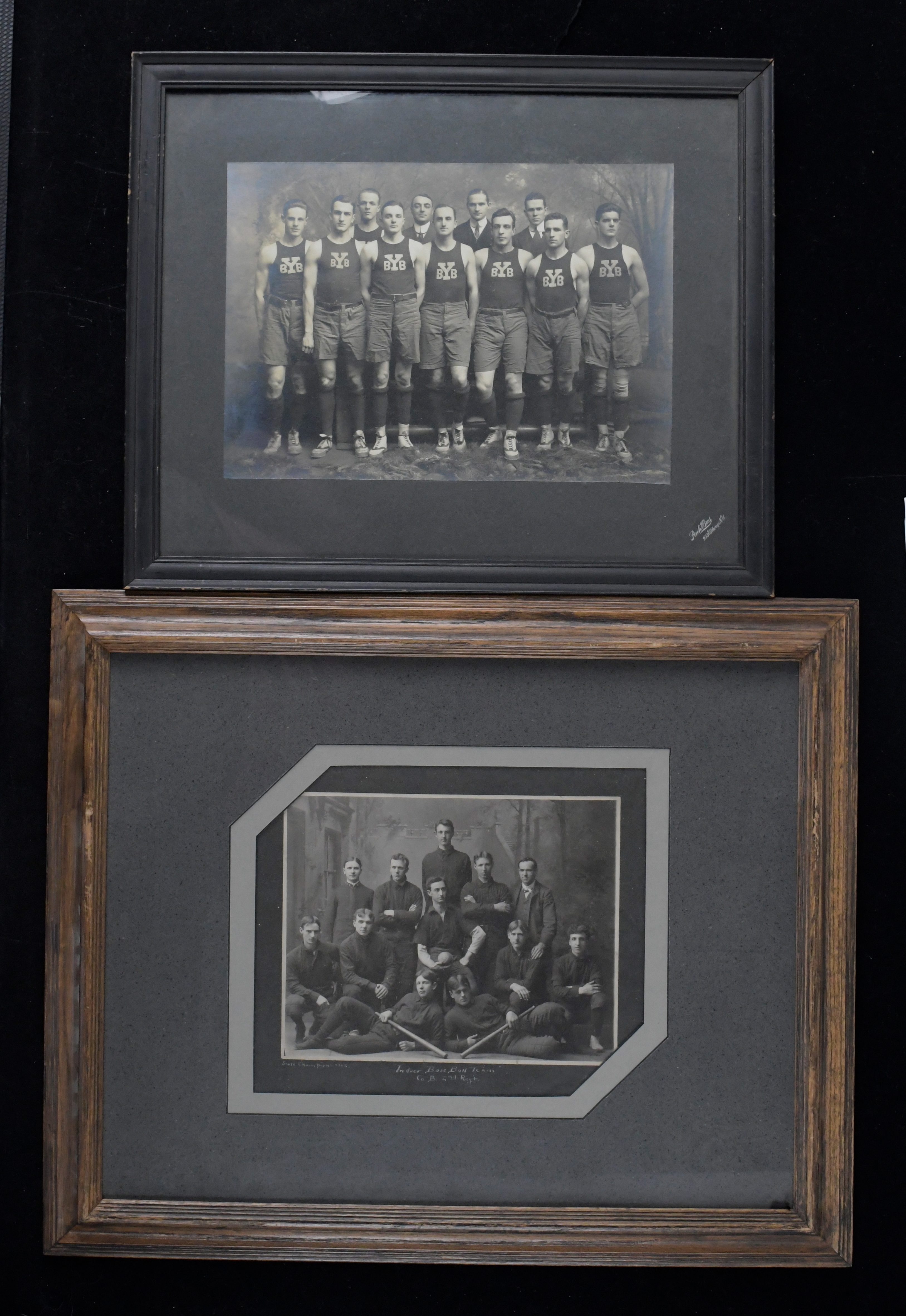 Description:Lot of (4) vintage baseball, basketball, and football team photos, c.1900s-10s (EX-EX/MT framed). Includes 7.5"x9.5" "State Champions 1902" "Indoor Base Ball Team" "Co. B. 2nd Reg't" photo (19.5"x23" framed), 11"x14" "Champs '09" football team photo wearing "H" jerseys (21.5"x25.5" framed), 11.25"x14" "Champions '10" baseball team photo wearing "H" jerseys (21.5"x25.5" framed), and c.1900s-10s 9.25"x13" basketball team photo wearing "Y" "B B" jerseys (possibly Yale, 16"x18.5" framed). Due to framing, complete conditions are unknown: EX-EX/MT appearance