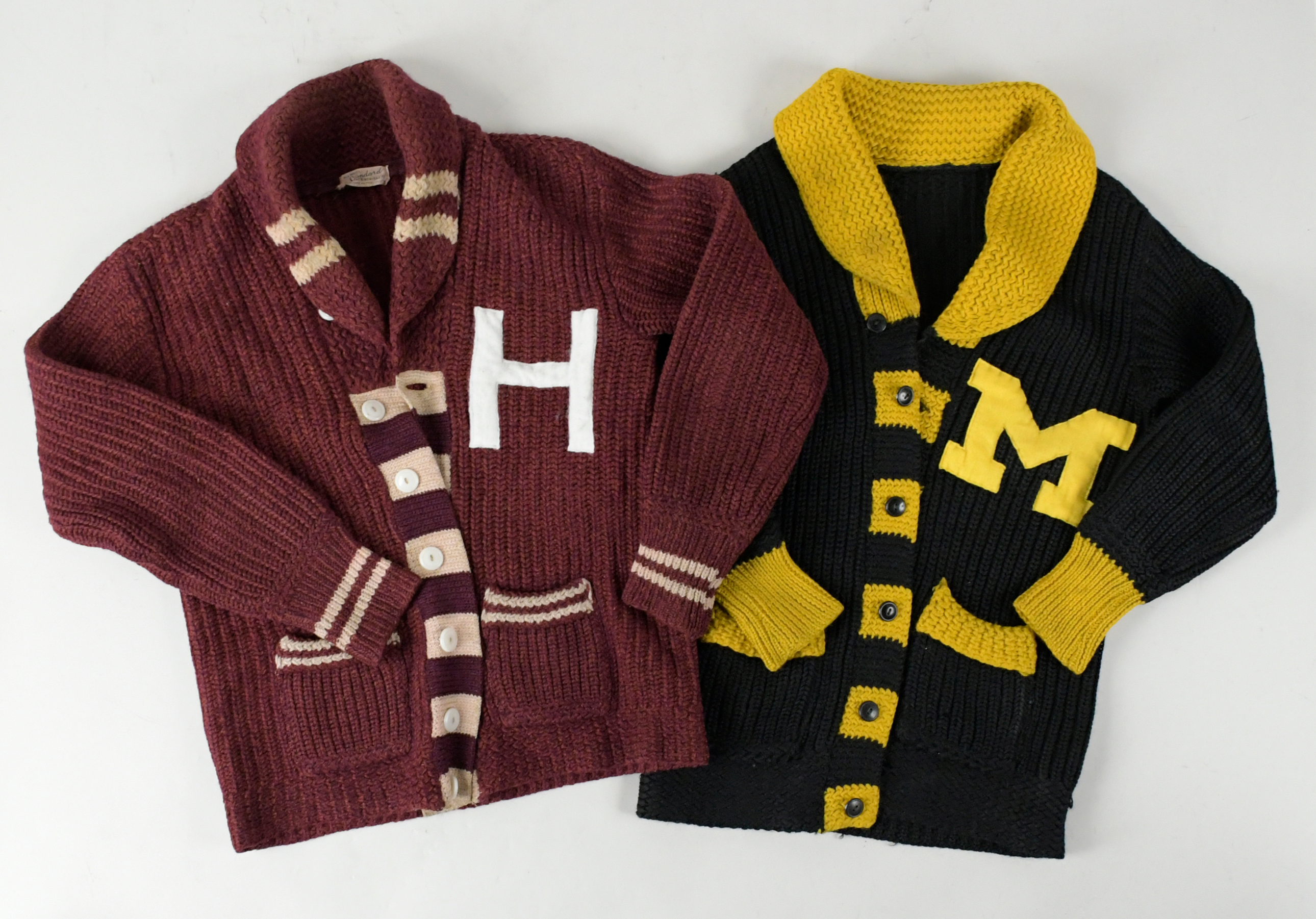 Description:Lot of (7) vintage letterman sweaters (VG/EX-EX/MT). Includes a Kaufman's black sweater with orange "BF" patch; Kandel Knitting Mills burgundy sweater with gold "C" patch, "Phyllis McArthur" name sewn below the collar tag, and "Phyl" on the left pocket; Black sweater (heavily worn tag) with yellow "H" patch; Standard Knitting Co. maroon sweater with white "H" patch; Untagged maroon sweater with black "L" patch; Untagged black sweater with gold trim and yellow "M" patch; Untagged navy blue sweater with white "M" patch: VG/EX-EX/MT