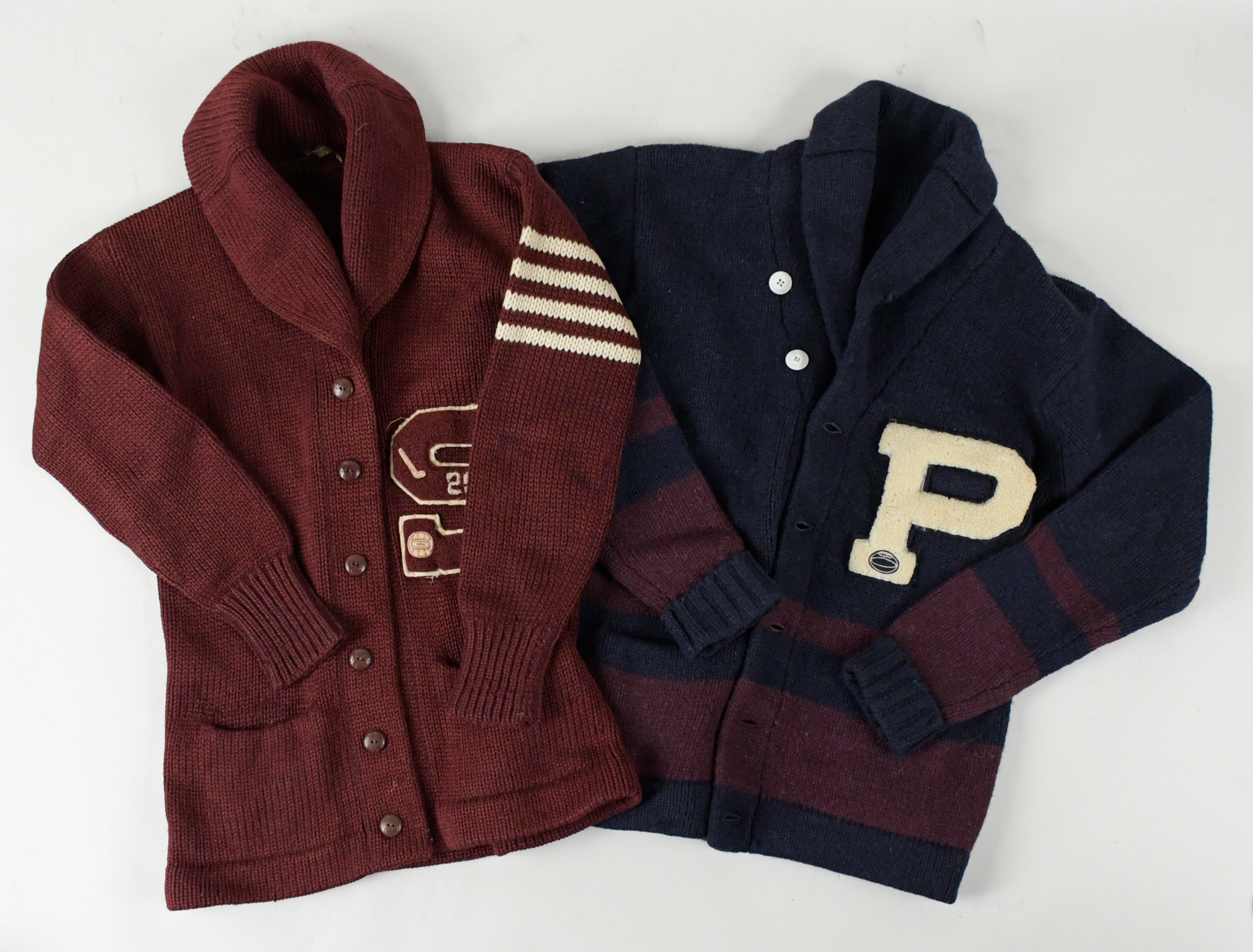 Description:Lot of (7) vintage letterman sweaters (VG/EX-EX/MT). Includes untagged gray sweater with black "M" patch, untagged dark blue sweater with maroon trim and white "P" patch which has a small football patch, untagged white sweater with orange "P" patch, Society Sportswear burgundy sweater with gray "P" patch, Honor Knitting Mills navy blue sweater with red "R" patch and "Dick Hensley" name sewn inside the tail, navy blue sweater (heavily worn tag) with white "RI" patch (worn name tag inside the tail), and maroon sweater (heavily worn tag) with white trimmed maroon "S" patch which has small patches of multiple sports and "29": VG/EX-EX/MT