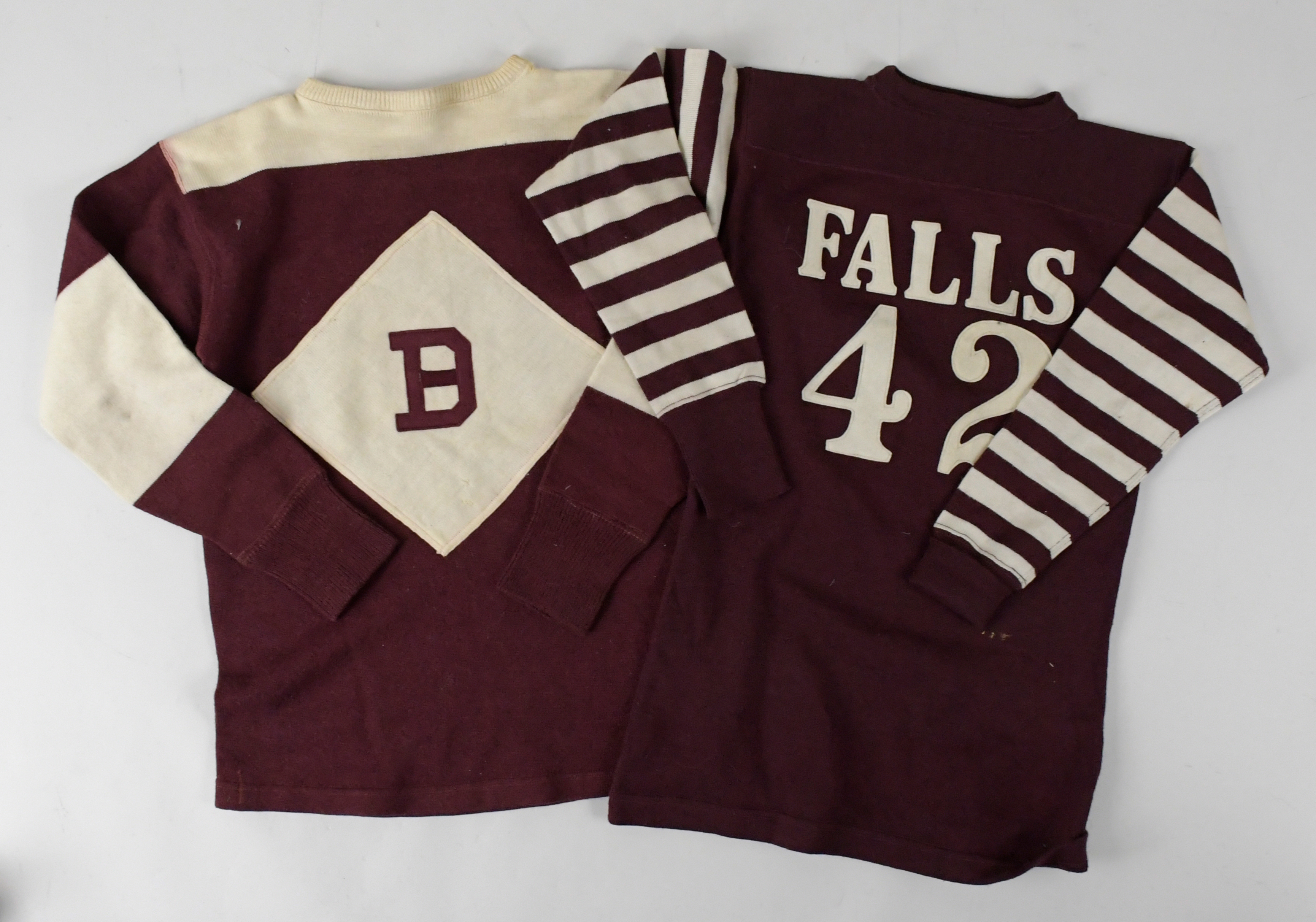 Description:Lot of (2) vintage football jerseys, c.1920s-30s (EX-EX/MT). Includes a Champion Knitwear Mills maroon/white "B" jersey with #65 on the back, and Favorite Knitting Mills maroon/white "BC" jersey with "FALLS" and #42 on the back: EX-EX/MT
