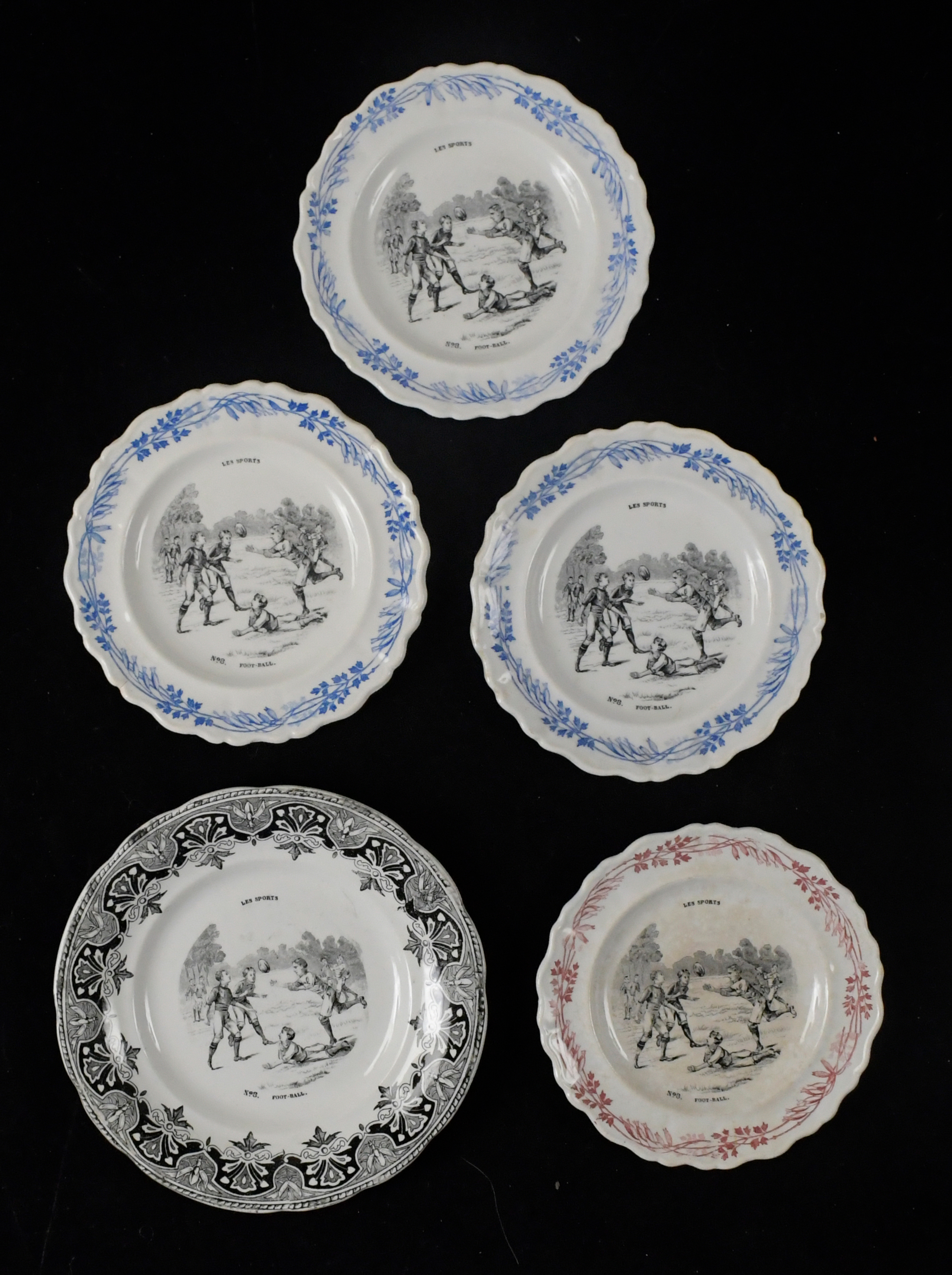 Description:Lot of (5) vintage Terre De Fer "Les Sports" decorative football plates, c.early 1900s (GD-EX). Includes 8" plate and (4) 6.5" plates. All have Terre De Fer marks on the bottom. Most plates appear to average VG-VG/EX overall. Range: GD-EX