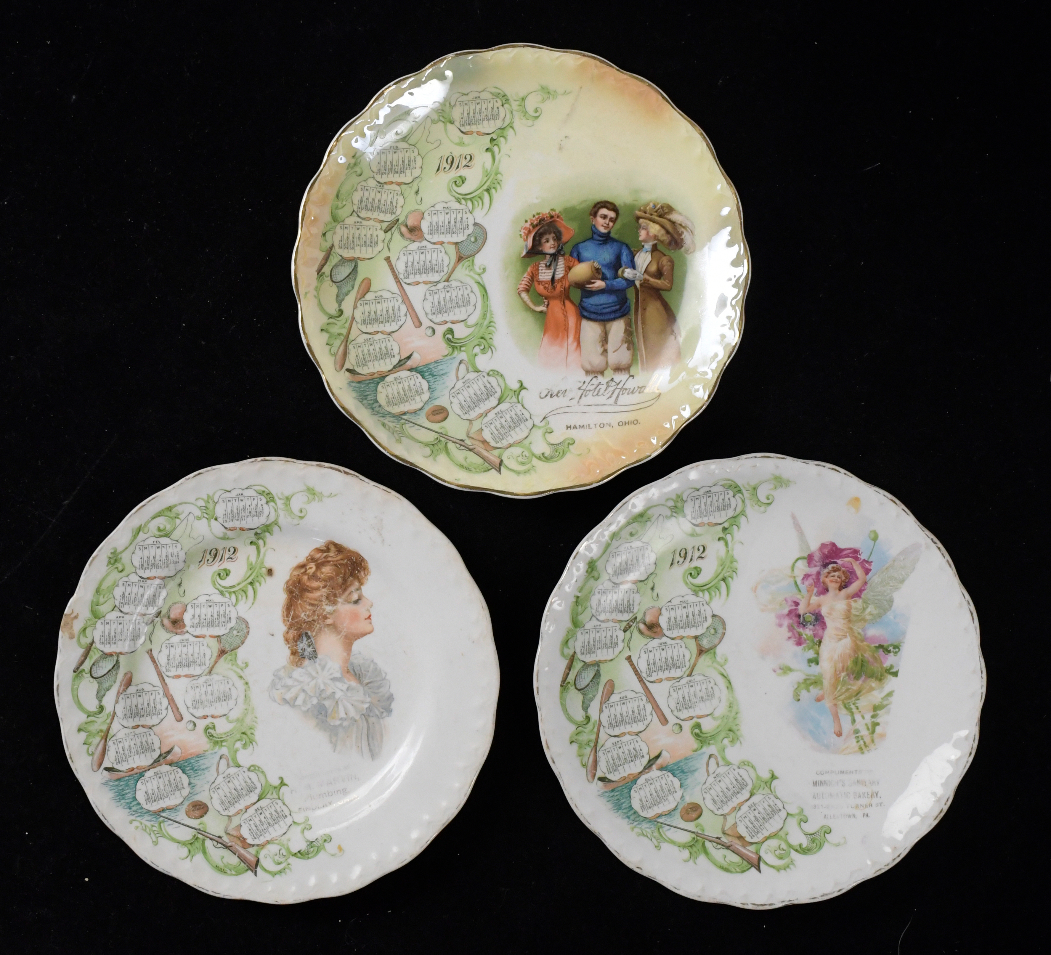Description:Lot of (3) different 1912 sports themed promotional calendar plates (GD-EX). Includes 8.25" Minnich's Sanitary Automatic Bakery (VG Allentown, PA); 8.25" New Hotel Howald (VG/EX-EX Hamilton, OH); and 8" H.M. Marvin Plumbing (GD-G/VG Findlay, OH).