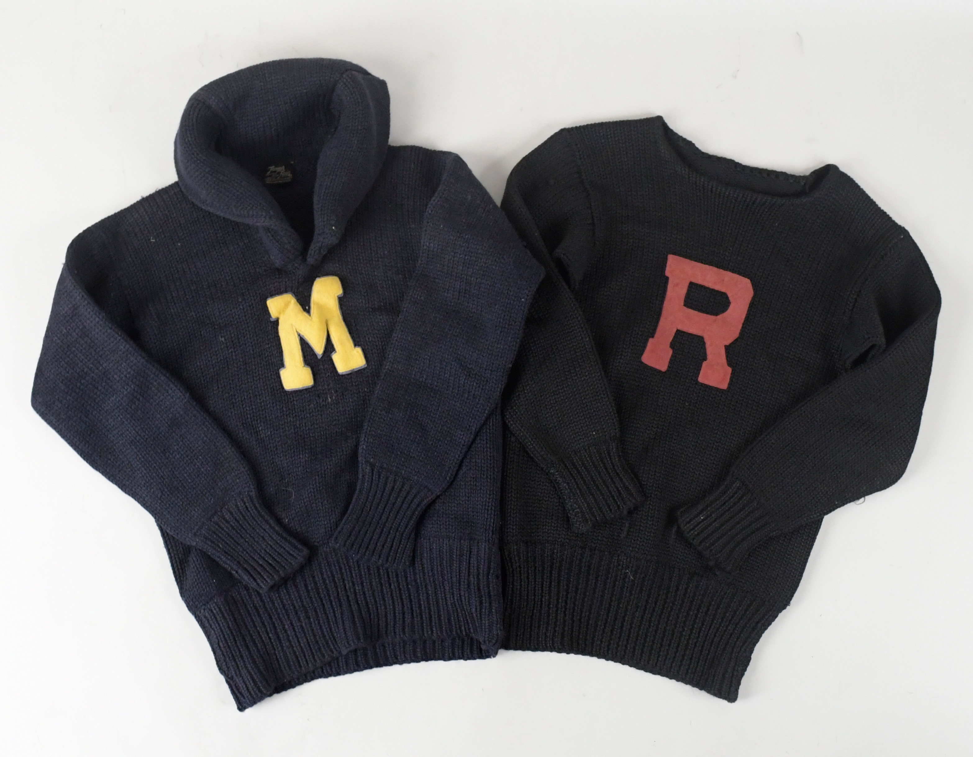 Description:Lot of (8) vintage letterman sweaters (VG/EX-EX/MT). Includes untagged white sweater with blue "M" patch; Fain Knitting Mills navy blue sweater with yellow "M" patch; Wil Wite black sweater with white "N" patch along with "D. Taylor" name sewn below the collar tag; Black sweater (heavily worn tag) with gold "P" patch along with "Butner" name sewn inside the tai; Kandel Knitting Mills cream colored sweater with yellow "P" patch, "Pirates" on the back, "Nancy Sorrels" below the collar tag, and "Nancy" on the right sleeve; Untagged white sweater with blue-trimmed white "Q" patch which has a small volleyball patch; Untagged red sweater with gold "Q" patch which has a small megaphone patch; and untagged black sweater with red "R" patch: VG/EX-EX/MT