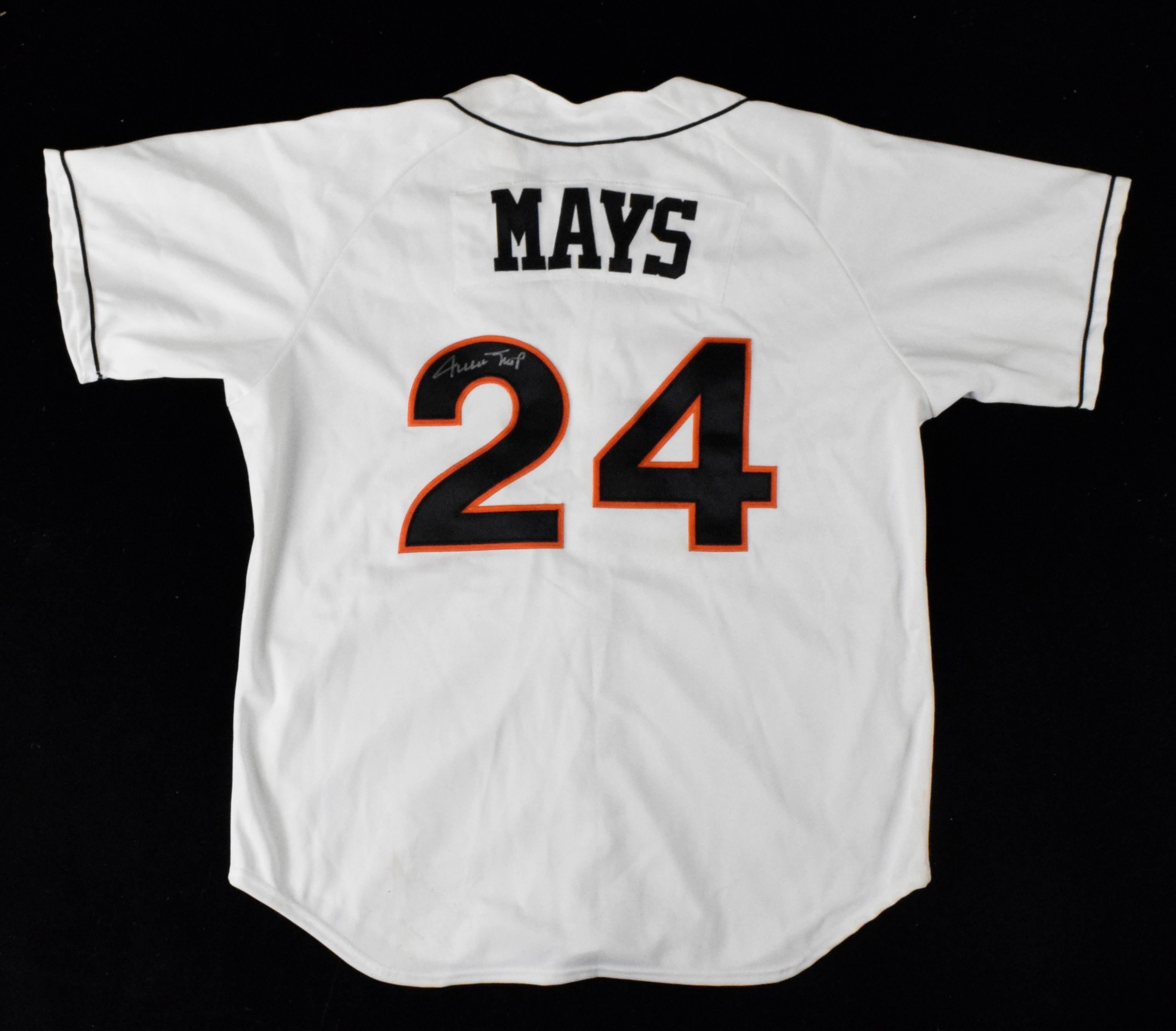 Description:Willie Mays autographed Hagerstown Suns jersey from 2004 ceremony honoring his baseball debut (Sig. NM, Jersey EX) Hagerstown Suns jersey has "Mays" nameplate on the back with number "24" below. He has signed the jersey in silver marker rating 8 out of 10. It was presented to him during an August 9, 2004 ceremony held in Hagerstown, MD (related articles and an image of Mays holding the jersey can be found online). Mays had made his professional debut with the Trenton Giants in a game against Hagerstown played in June 24, 1950. The Suns retired his number (at the 2004 ceremony) to mark to occassion. Wilson and size (50) tags in the collar and the jersey shows some light storage and wash wear. Includes certificate of provenance from the Willie Mays Collection: Sig NM, Jersey EX ($500-$1,000)