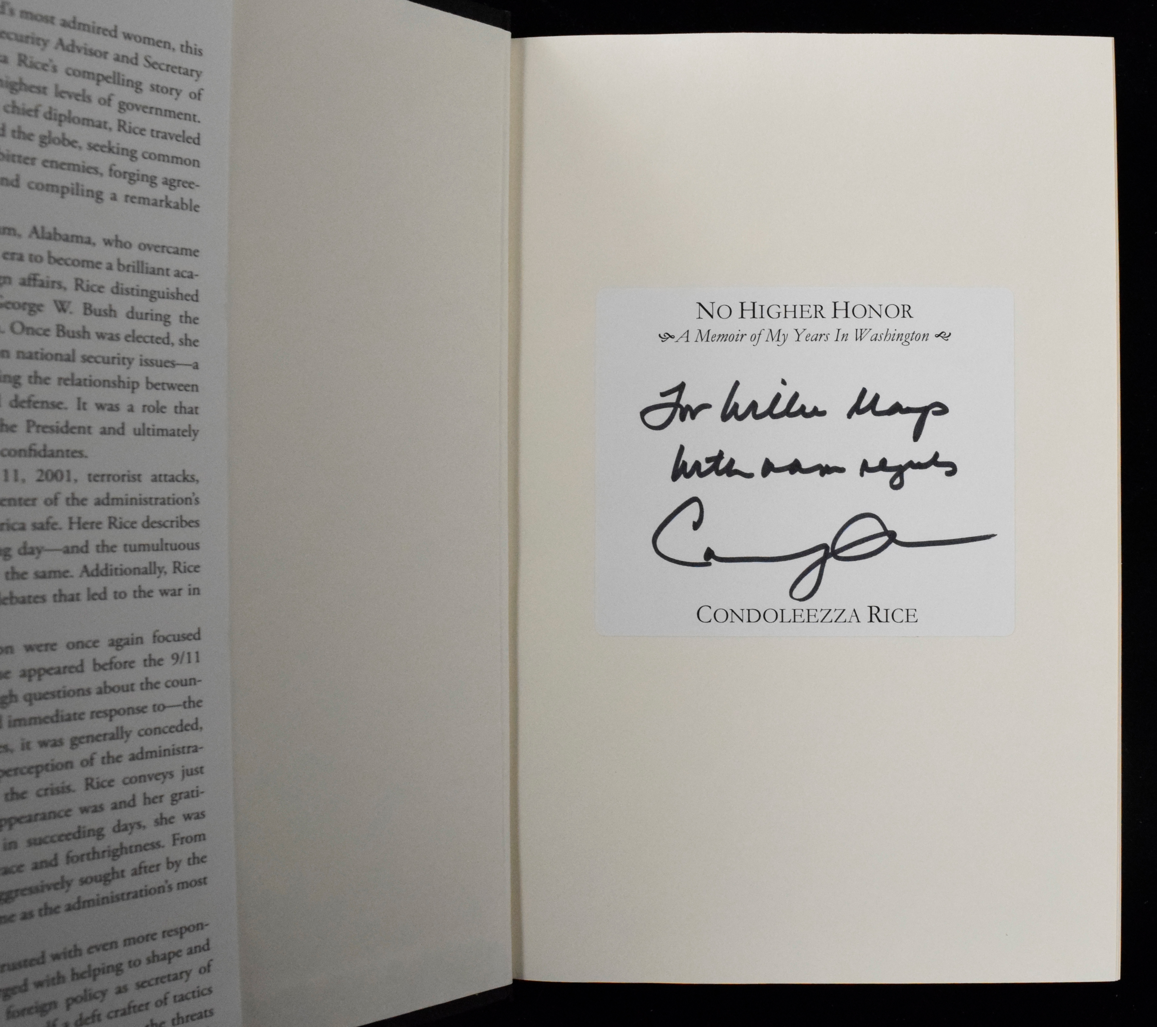 Description:Concoleezza Rice autographed book inscribed to Willie Mays (EX-NM) Hardcover copy of "No Higher Honor" has been signed on bookplate (affixed to first inside page) and inscribed "For Willie Mays" in marker rating 9/10 out of 10. Touch of light wear to dust jacket. Includes certificate of provenance from the Willie Mays Collection: EX-NM