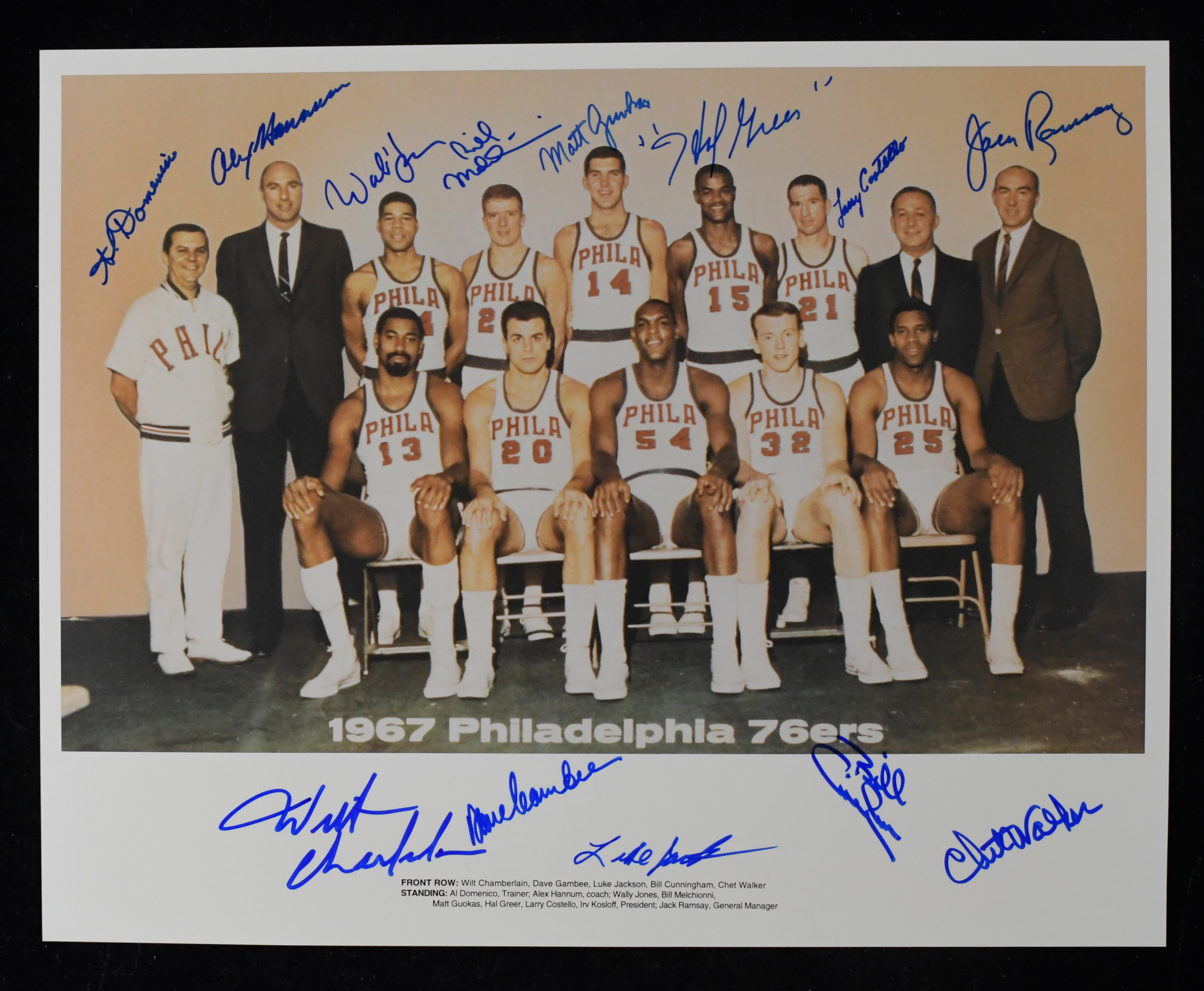 Description:1966-67 NBA champion Philadelphia 76ers team signed 16"x20" photograph (NM). Signed by (13) including Jack Ramsay, Alex Hannum, Wilt Chamberlain, Hal Greer, Chet Walker, Larry Costello, Billy Cunningham, Luke Jackson, Wali Jones, Dave Gambee, Matt Guokas, Bill Melchionni, and trainer Al Domenico. Signatures rate 8 to 10 out of 10: NM ($750-$1,000)