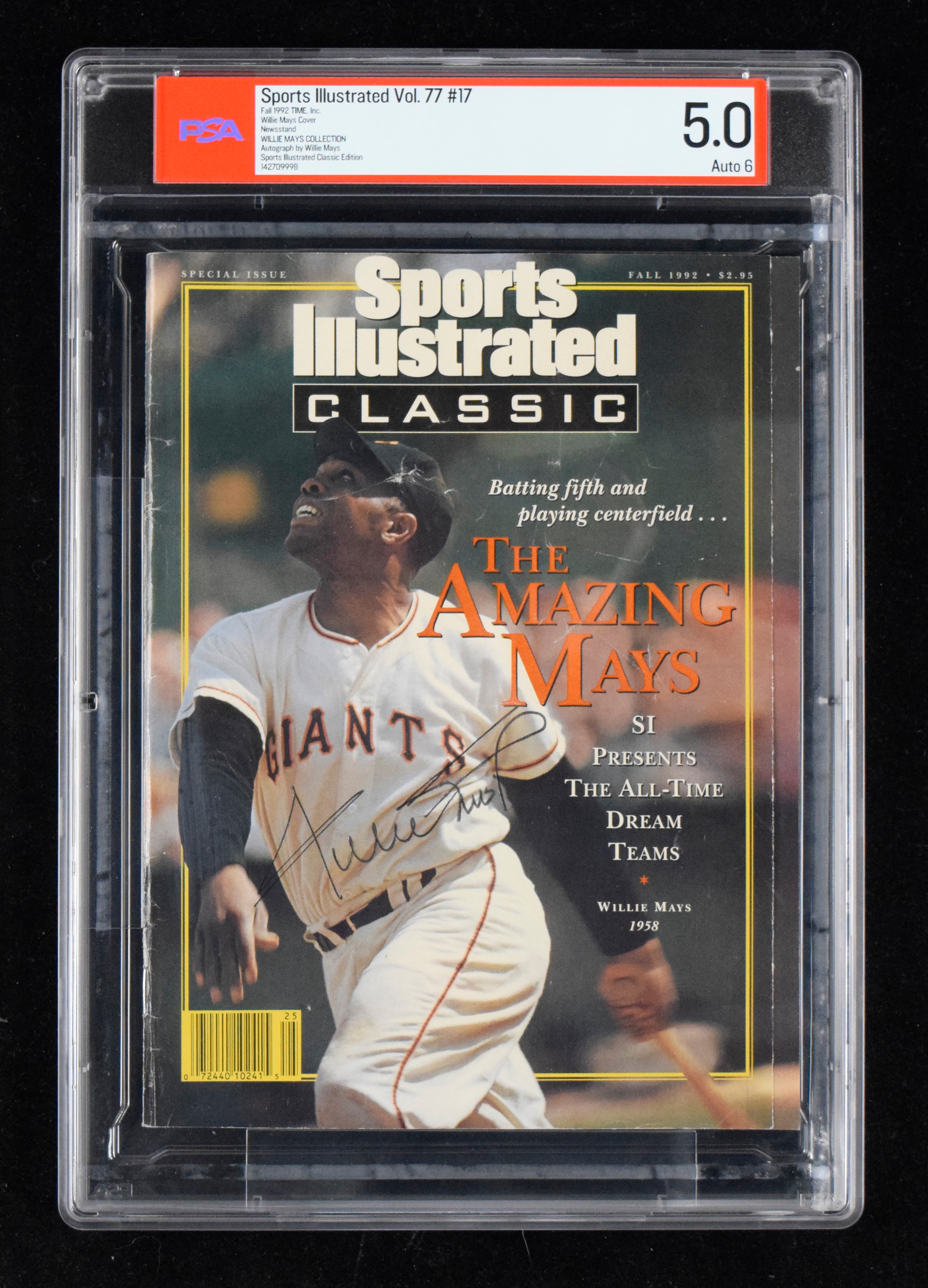 Description:Willie Mays autographed 1992 Sports Illustrated (PSA 5 with 6 auto). Graded by PSA with "Willie Mays Collection" pedigree noted on the label: PSA 5 with 6 auto