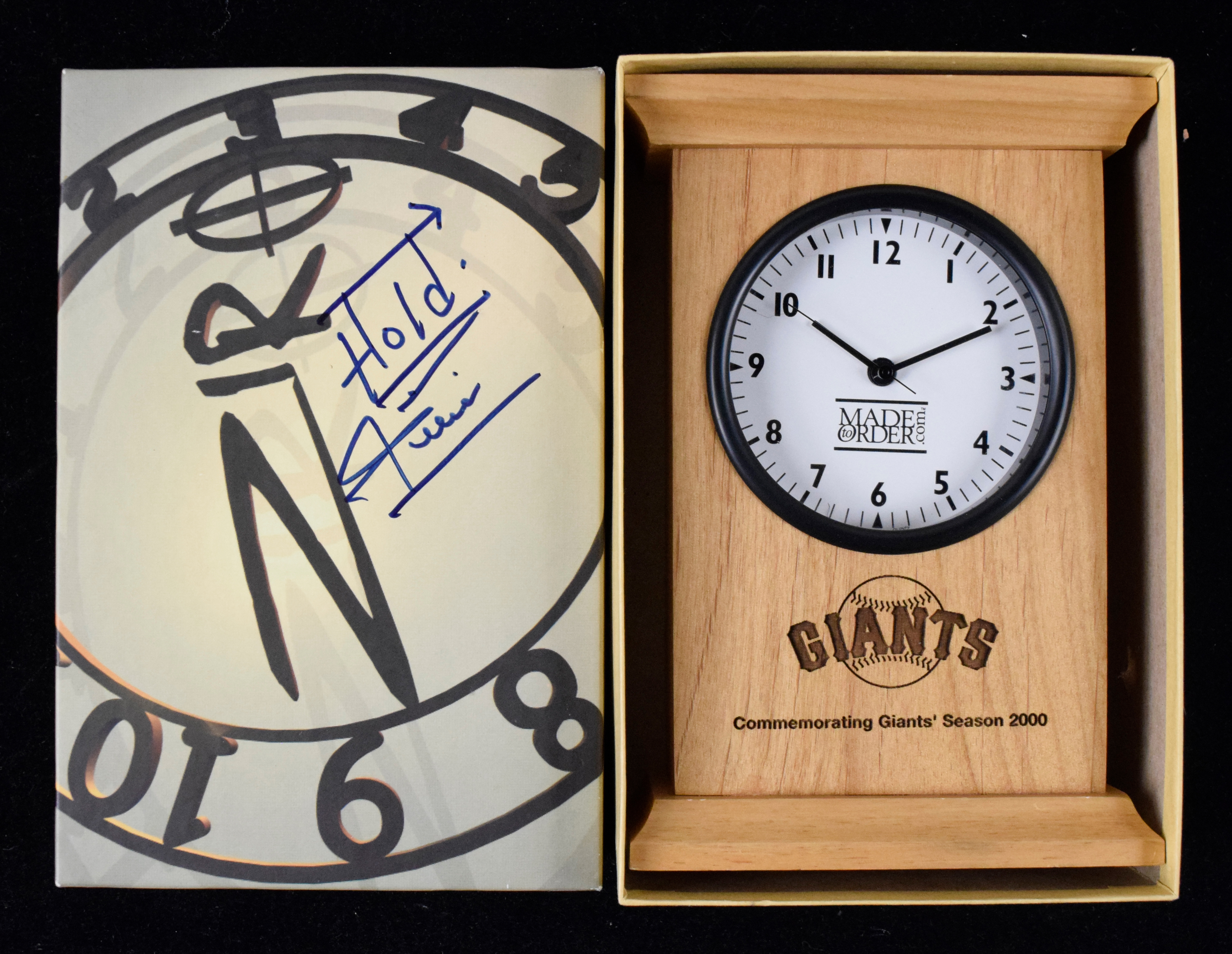 Description:2000 San Francisco Giants commemorative clock in "Willie" signed box (EX-NM) Nicely done clock (stands 7.5" tall) has the Giants team logo and "Commemorating Giants' Season 2000" text laser engraved on the front. It appears essentially unused and comes in the original box which has a "Willie" first name signature (marker, 9 out of 10) beneath his handwritten "Hold" notation. Touch of wear to box. Includes certificate of provenance from the Willie Mays Collection: EX-NM