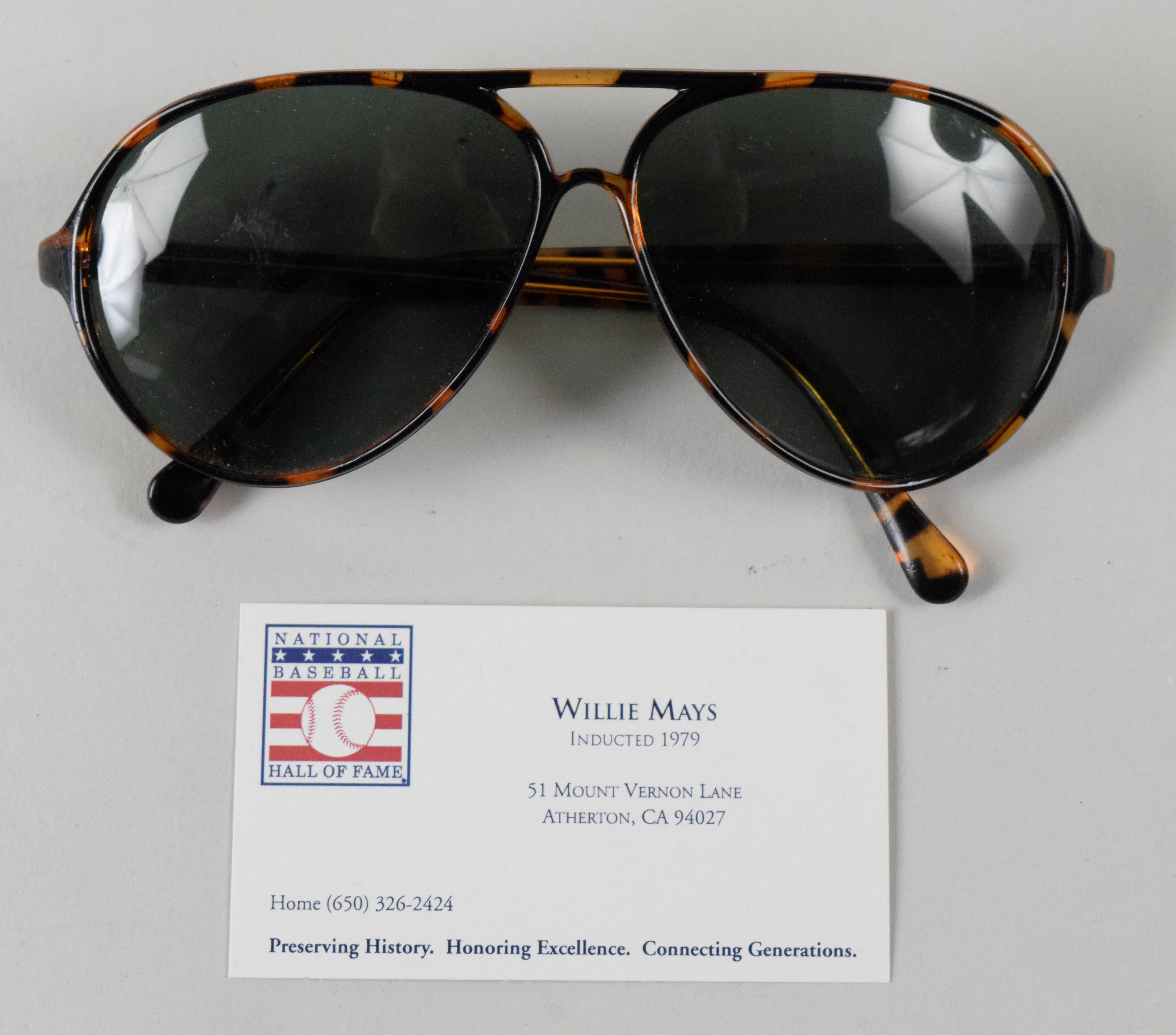 Description:Willie Mays' sunglasses (EX) Pair of sunglasses as used by Willie Mays showing some light general wear. Includes his personal Hall of Fame logo business card and certificate of provenance from the Willie Mays Collection: EX