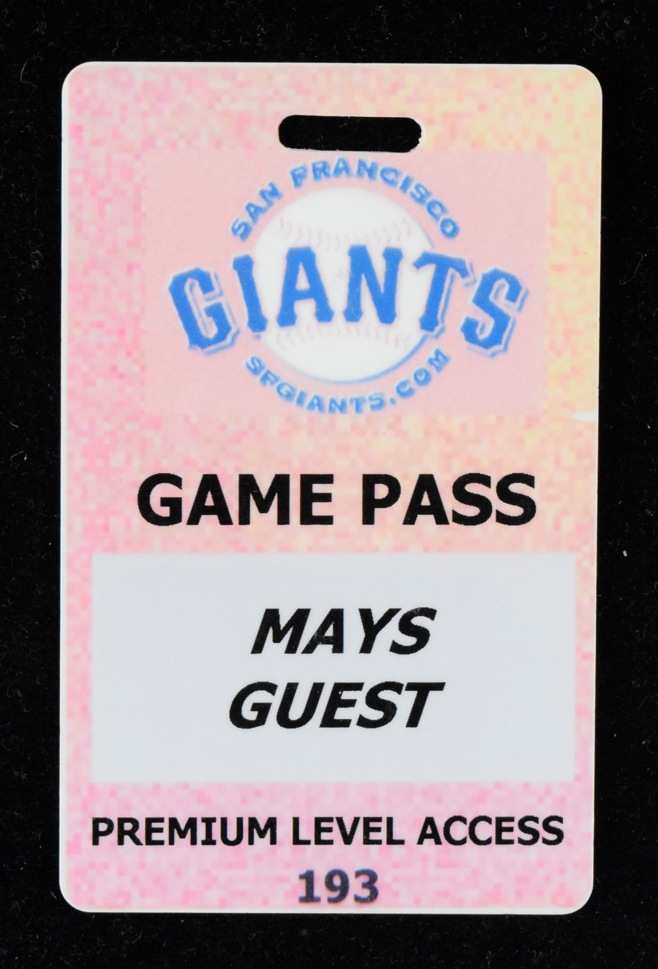 Description:"Mays Guest" San Francisco Giants game pass (EX) Credit card sized plastic pass issued by the Giants has "Mays Guest" printed on the front. Found within a leather card wallet in the Mays Collection and likely issued for use by Willie himself. Some fading to color. Includes certificate of provenance from the Willie Mays Collection: EX